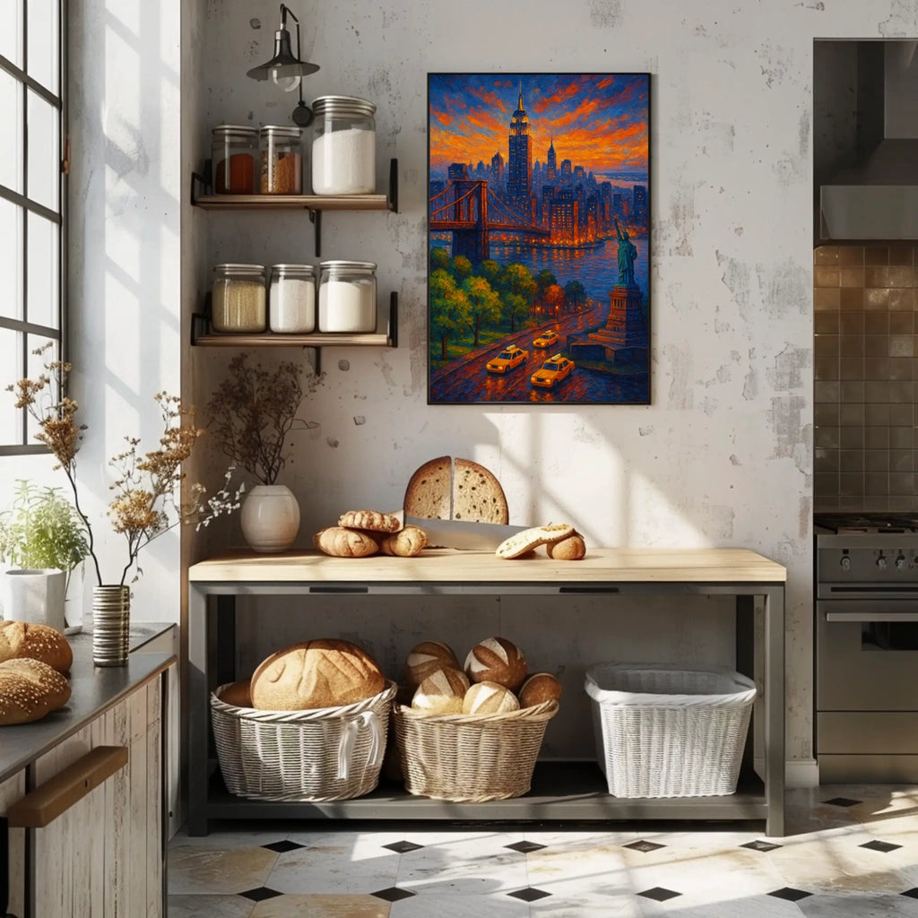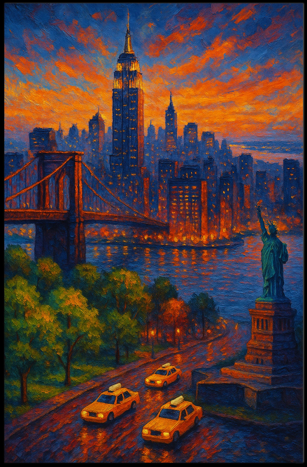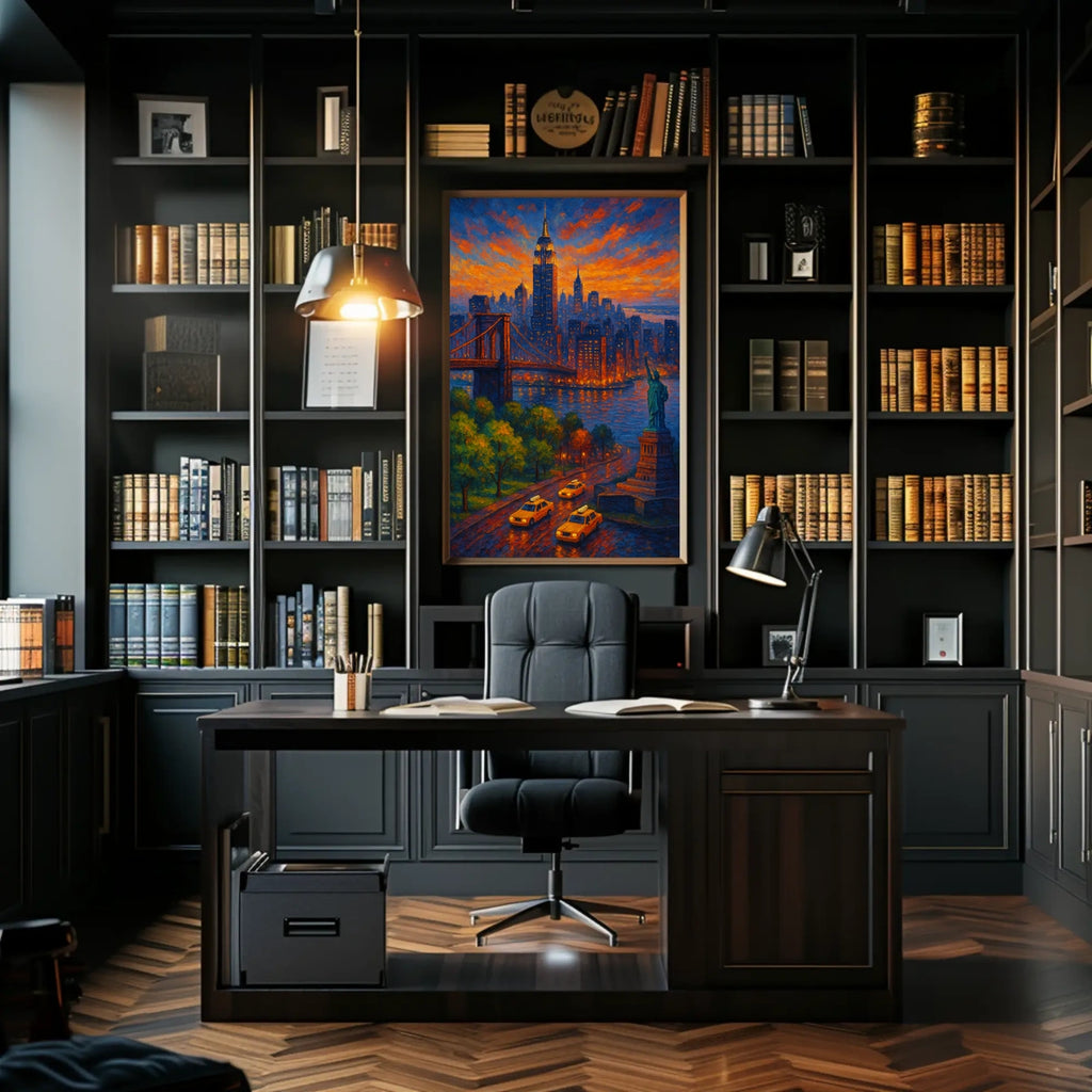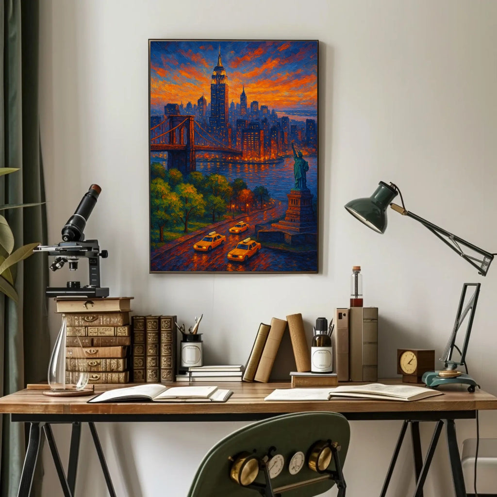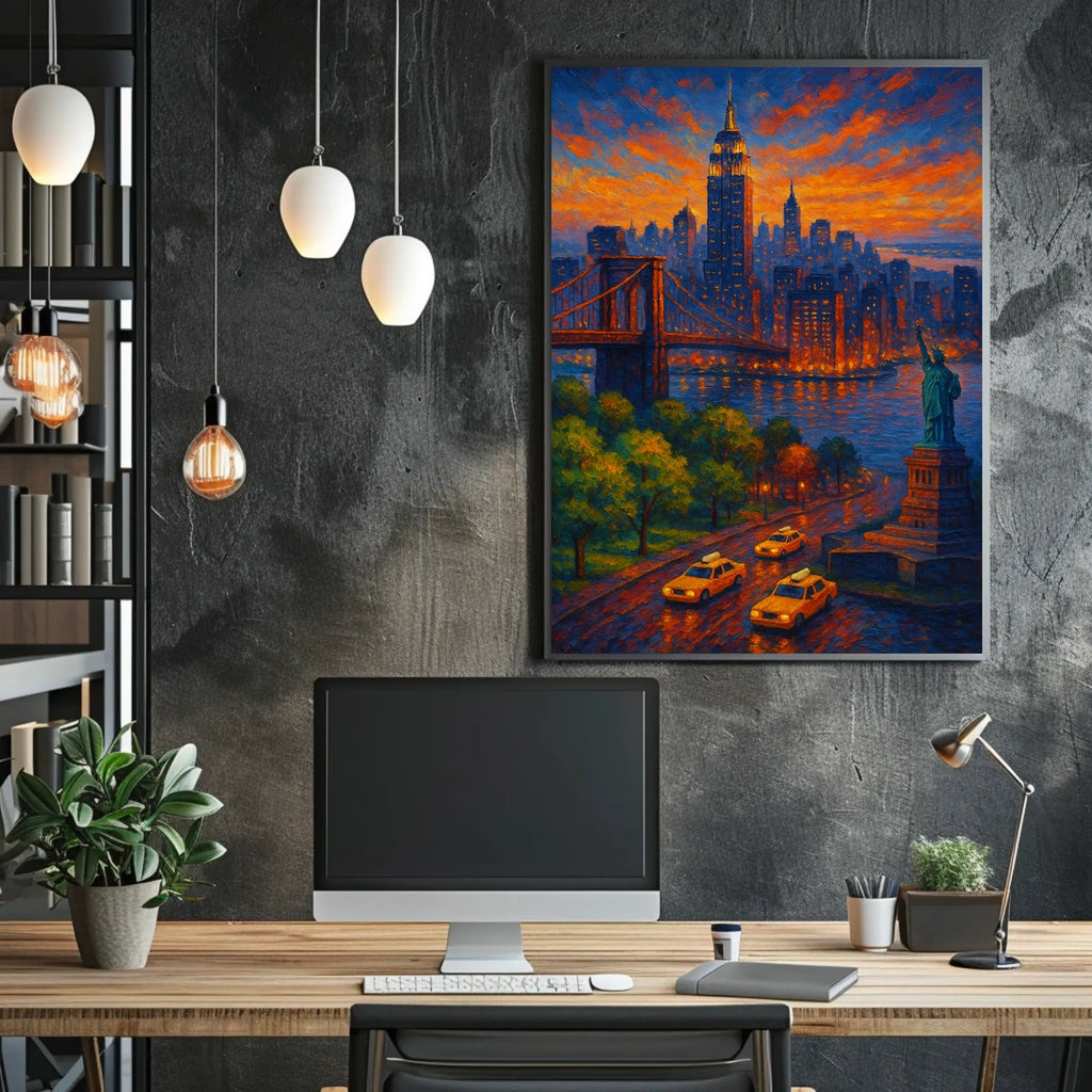Intro: Experience a luminous cityscape at dusk with Twilight in the City, an impressionistic painting that captures the glow of a sunset over towering skyscrapers, a majestic bridge, and the Statue of Liberty. This vibrant work enhances any space with warmth, movement, and timeless urban charm.
