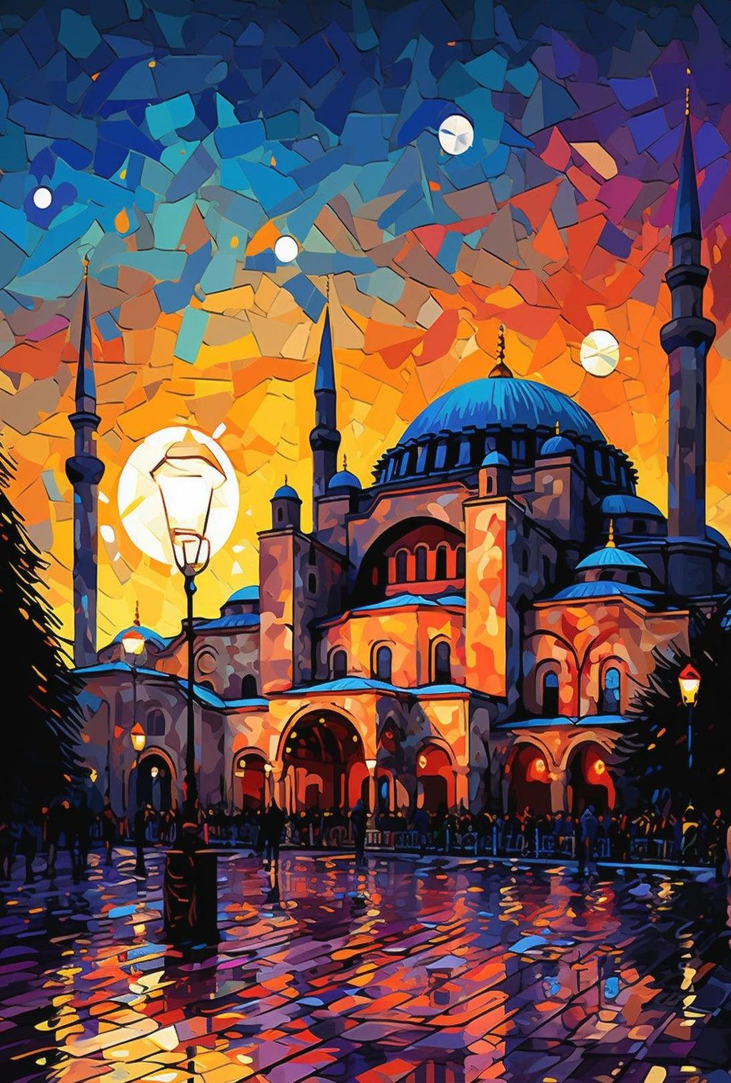 Twilight Mosque Scene Cultural Heritage Poster from PosterGoat brings a vivid, mosaic-inspired evening panorama of historical architecture into your home. This captivating poster captures the dome and soaring minarets of a landmark mosque washed in warm twilight hues, contrasted with cool blue domes and a jewel-like, stained-glass sky.