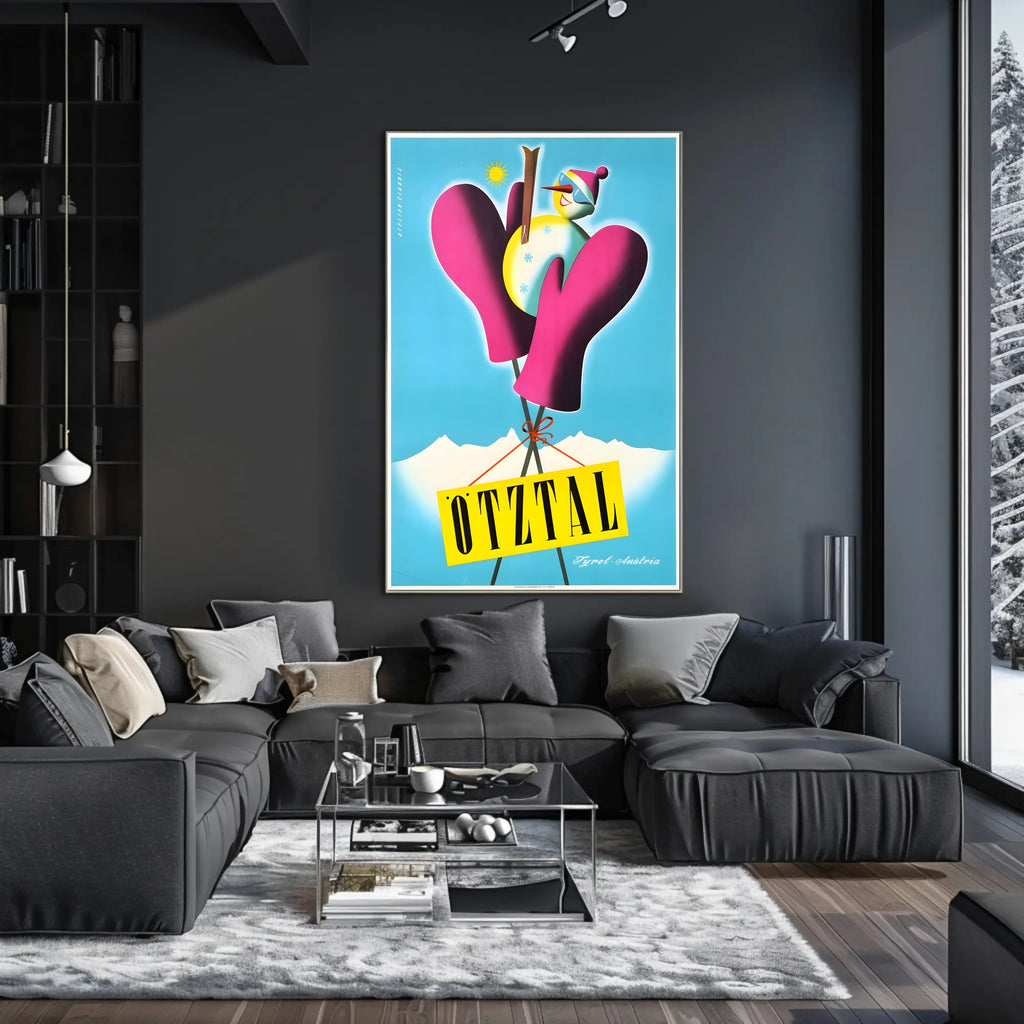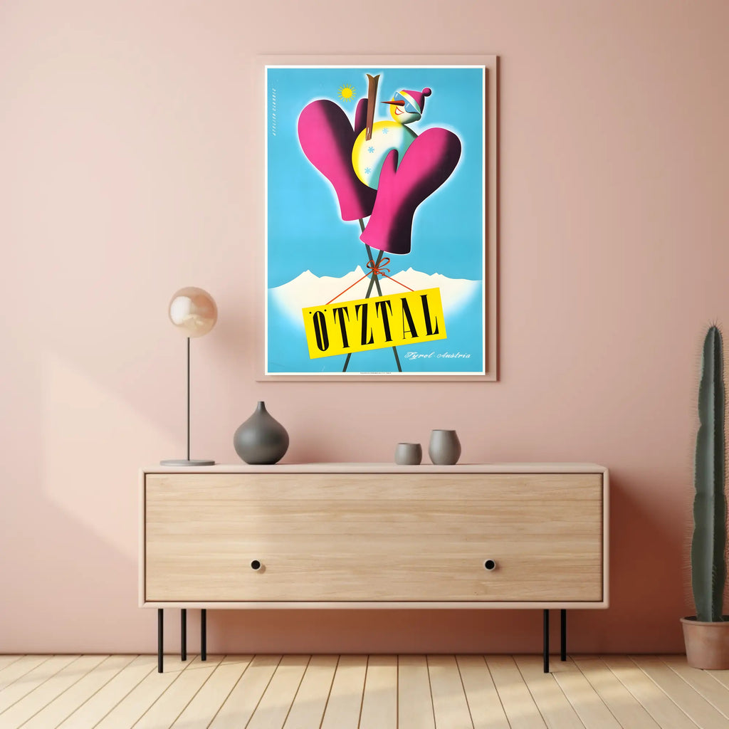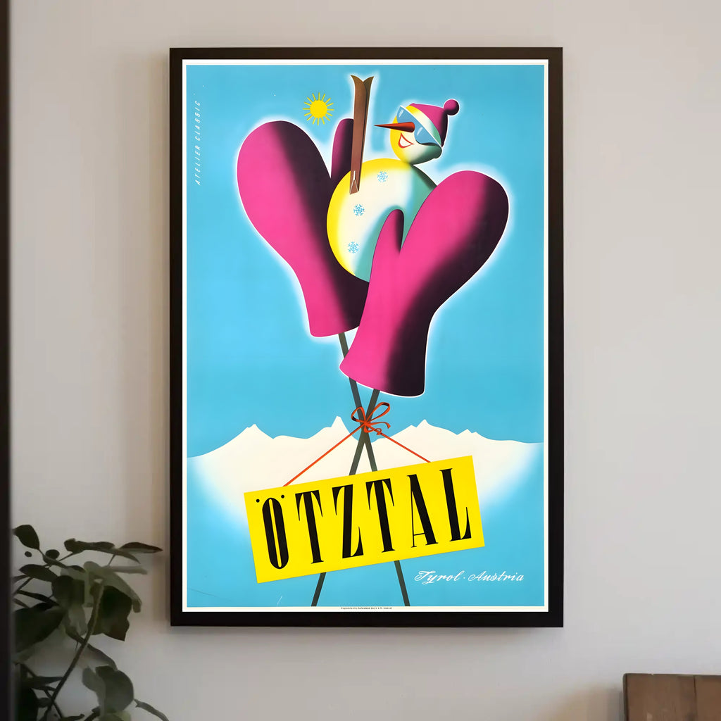 Bring the magic of alpine snowfields into your home with the Ötztal Winter Wonderland Poster from PosterGoat. This vibrant art print captures a playful winter scene — a cheerful snowman tucked between oversized fuchsia mittens, crossed skis, and a bold yellow "ÖTZTAL" sign set against a clear turquoise sky and crisp mountain silhouette. The minimalist, vintage-style composition creates an instant focal point for any room, perfect for travel lovers, ski enthusiasts, and collectors of scenic wall art.