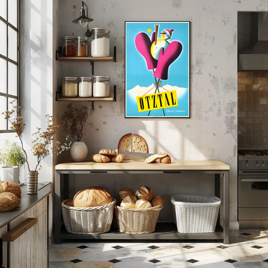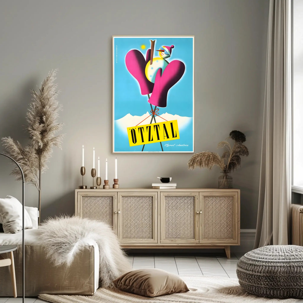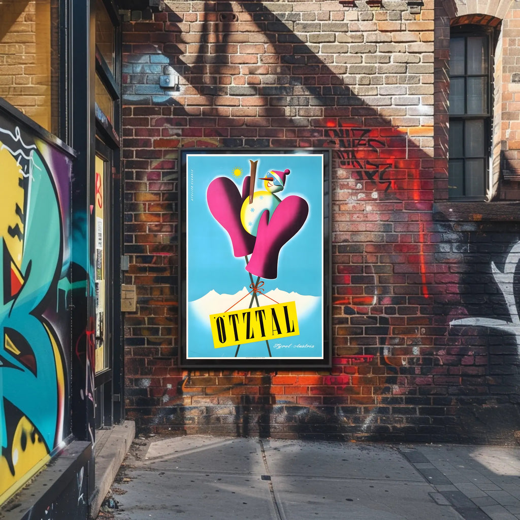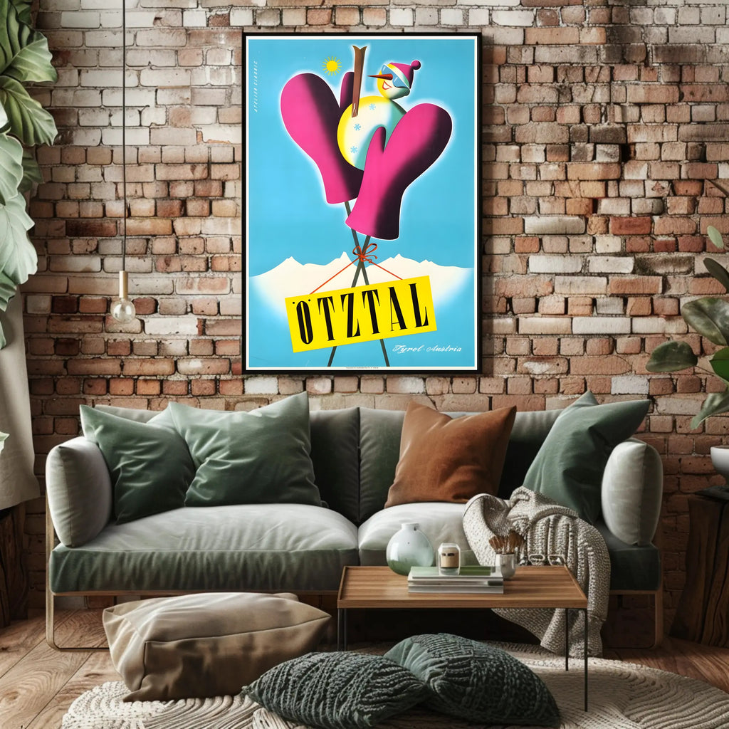 Bring the magic of alpine snowfields into your home with the Ötztal Winter Wonderland Poster from PosterGoat. This vibrant art print captures a playful winter scene — a cheerful snowman tucked between oversized fuchsia mittens, crossed skis, and a bold yellow "ÖTZTAL" sign set against a clear turquoise sky and crisp mountain silhouette. The minimalist, vintage-style composition creates an instant focal point for any room, perfect for travel lovers, ski enthusiasts, and collectors of scenic wall art.
