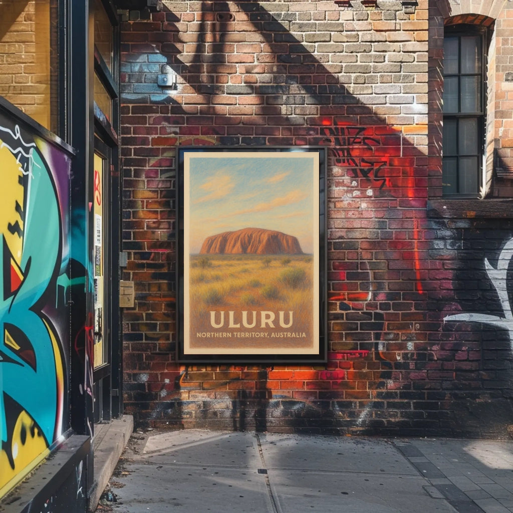 Bring the wild beauty of the Northern Territory into your space with this timeless piece that blends the sandstone majesty of Uluru, the vast blue skies, and the nostalgic charm of retro travel posters. Perfect for homes, offices, galleries, or educational settings, this Uluru travel poster adds a touch of Australian heritage and wild beauty to any wall.