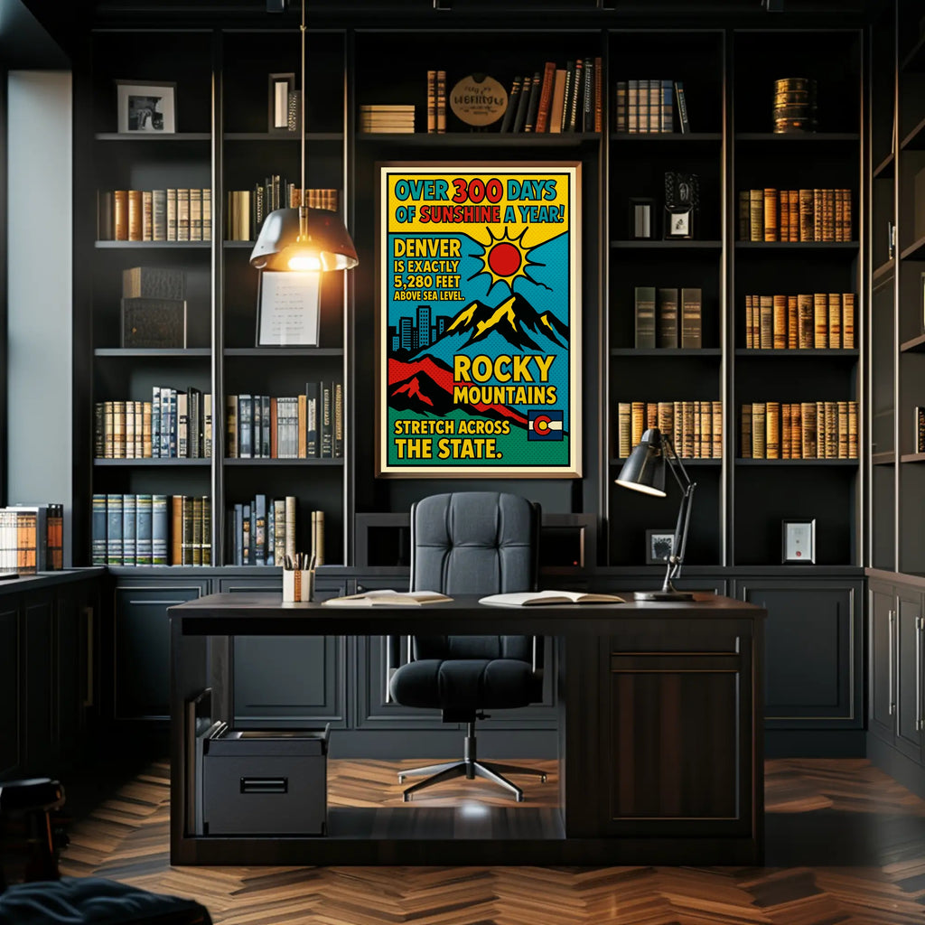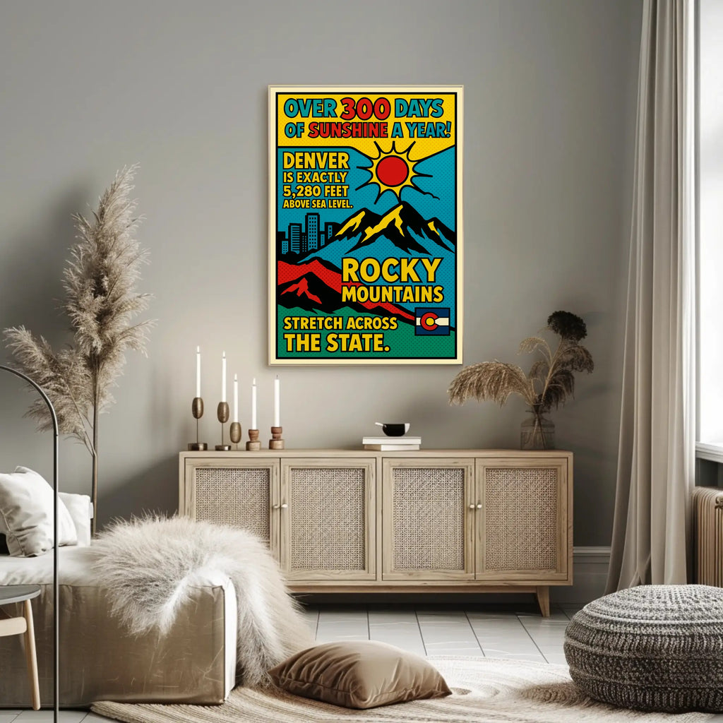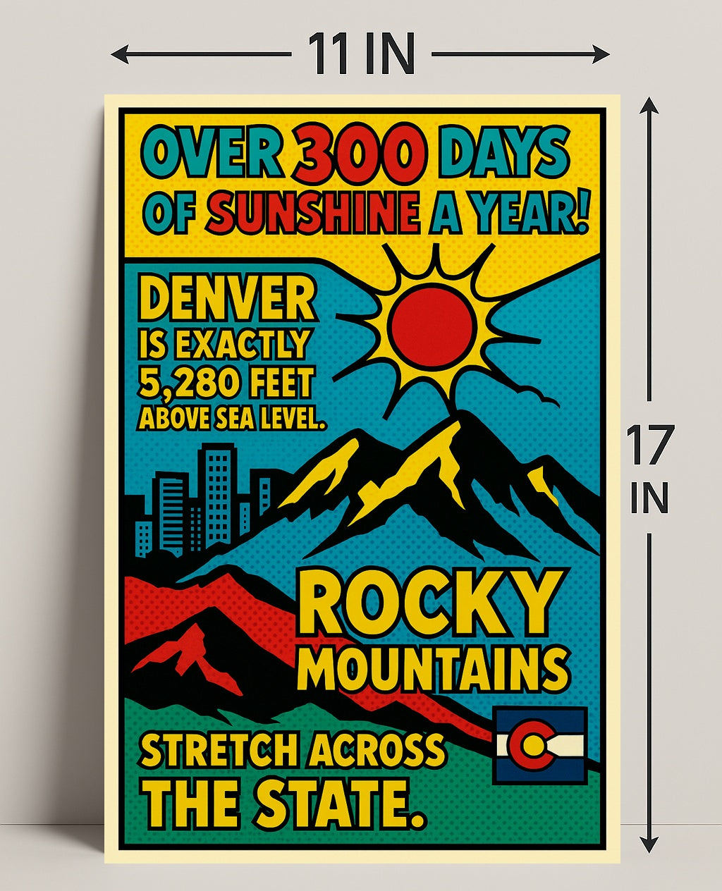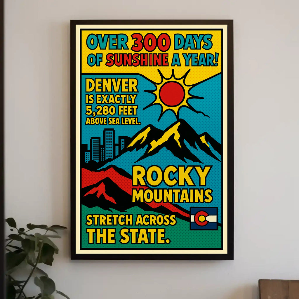 Add the uncategorized visual poster from PosterGoat to your cart today — brighten your space with a piece of pop‑art scenery that celebrates the Rocky Mountains and Denver's sunny charm.