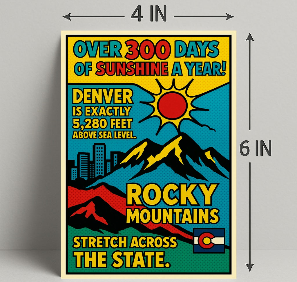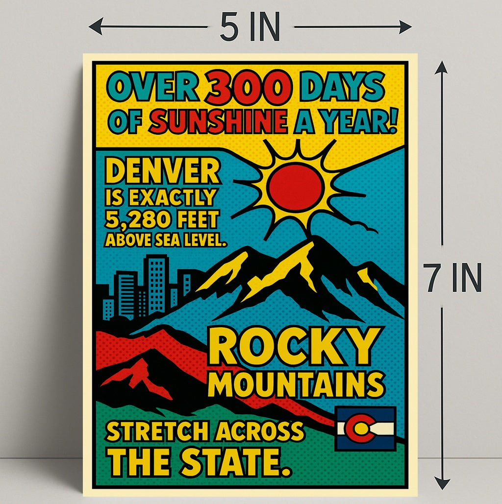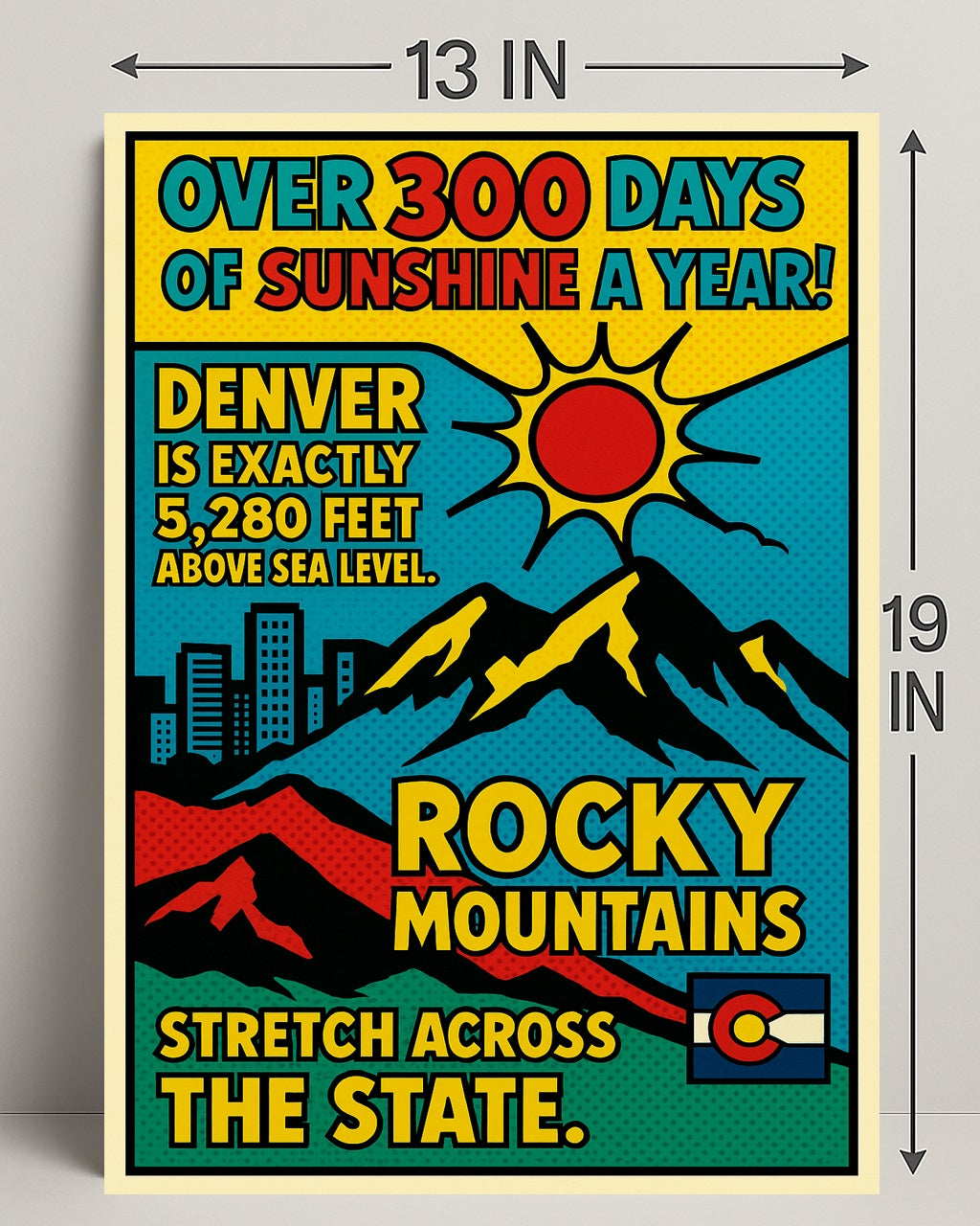 - Scenic storytelling: Text elements highlight Denver's elevation and the Rocky Mountains stretching across the state — perfect for travelers, locals, and souvenir collectors.