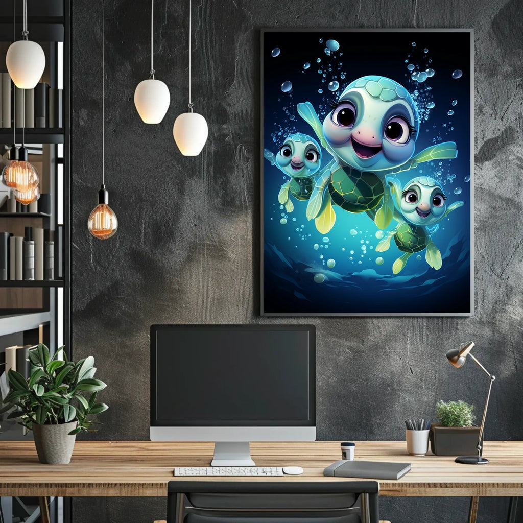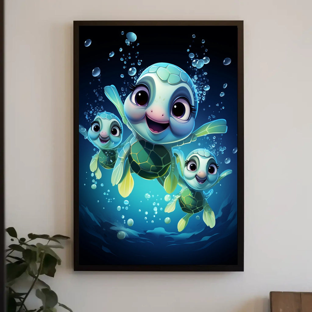 Dive into a vibrant underwater world with three charming cartoon sea turtles. These animated creatures, with their large, expressive eyes and joyful smiles, swim amidst a sea of bubbles, creating a lively and enchanting aquatic scene. The modern, playful artistic style is characterized by bright, bold colors and smooth, stylized designs, making it an ideal choice for young audiences and fans of sea life.