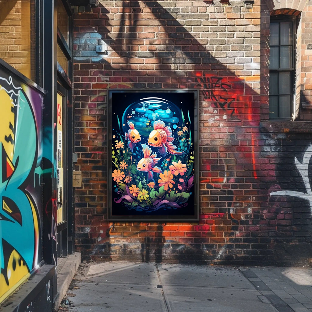 Immerse yourself in a vibrant aquatic paradise with Underwater Harmony, a stunning artwork where a kaleidoscope of colorful fish glides through lush, blooming underwater flora. This serene scene captures ocean tranquility and serene beauty, with delicate bubbles and shimmering scales enhancing the enchantment of every view.