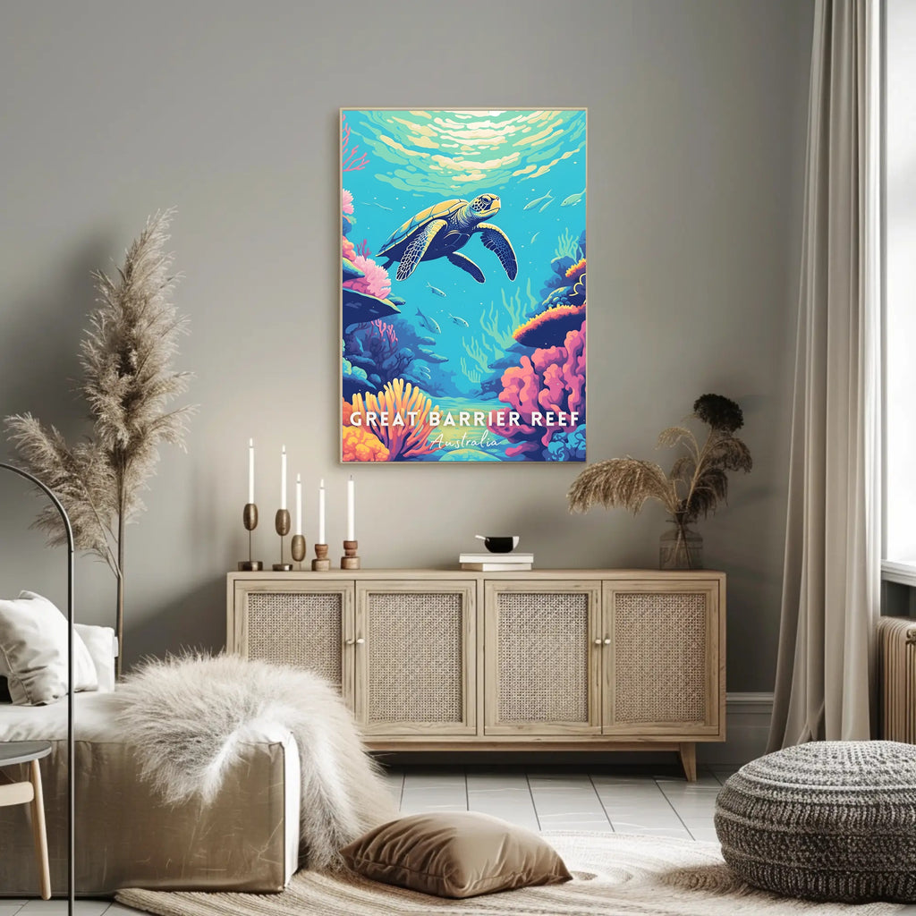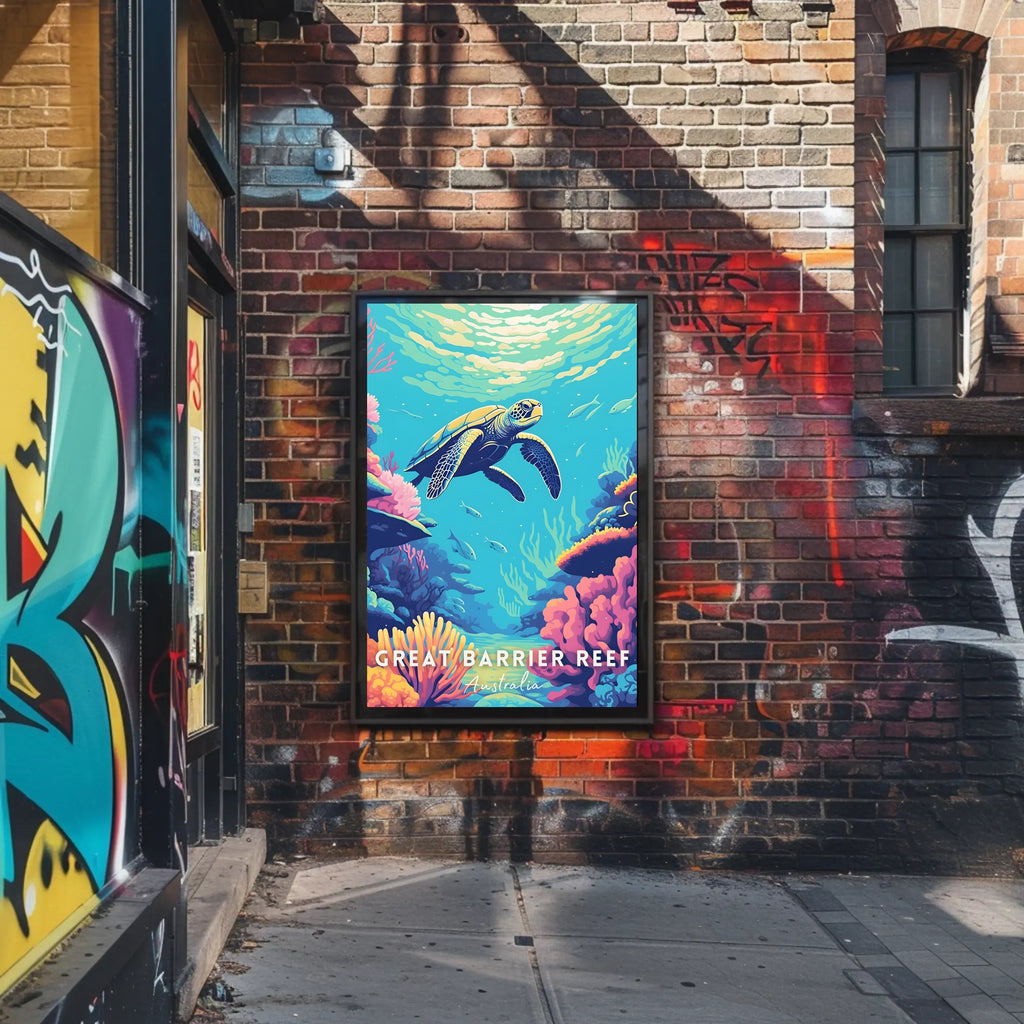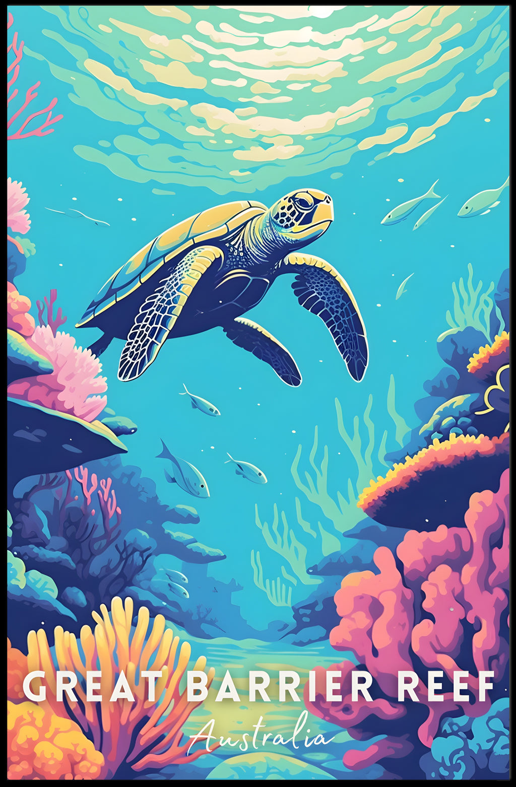 Dive into a lively underwater realm with this enchanting depiction of the Great Barrier Reef. The poster showcases a serene sea turtle gliding gracefully through a kaleidoscope of colorful coral formations and small, darting fish. The scene captures the essence of marine beauty, featuring bright, saturated colors and bold, clean lines that embody a contemporary artistic flair. This modern illustrative style infuses the artwork with a dynamic and celebratory tone, emphasizing the importance of nature conservation and the wonders of exploration. Perfect for ocean enthusiasts and art lovers alike, it's a visual tribute to one of the world's most treasured ecosystems.