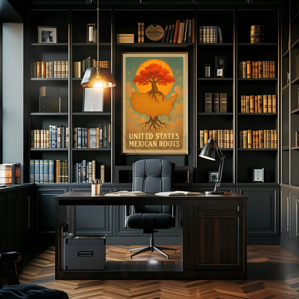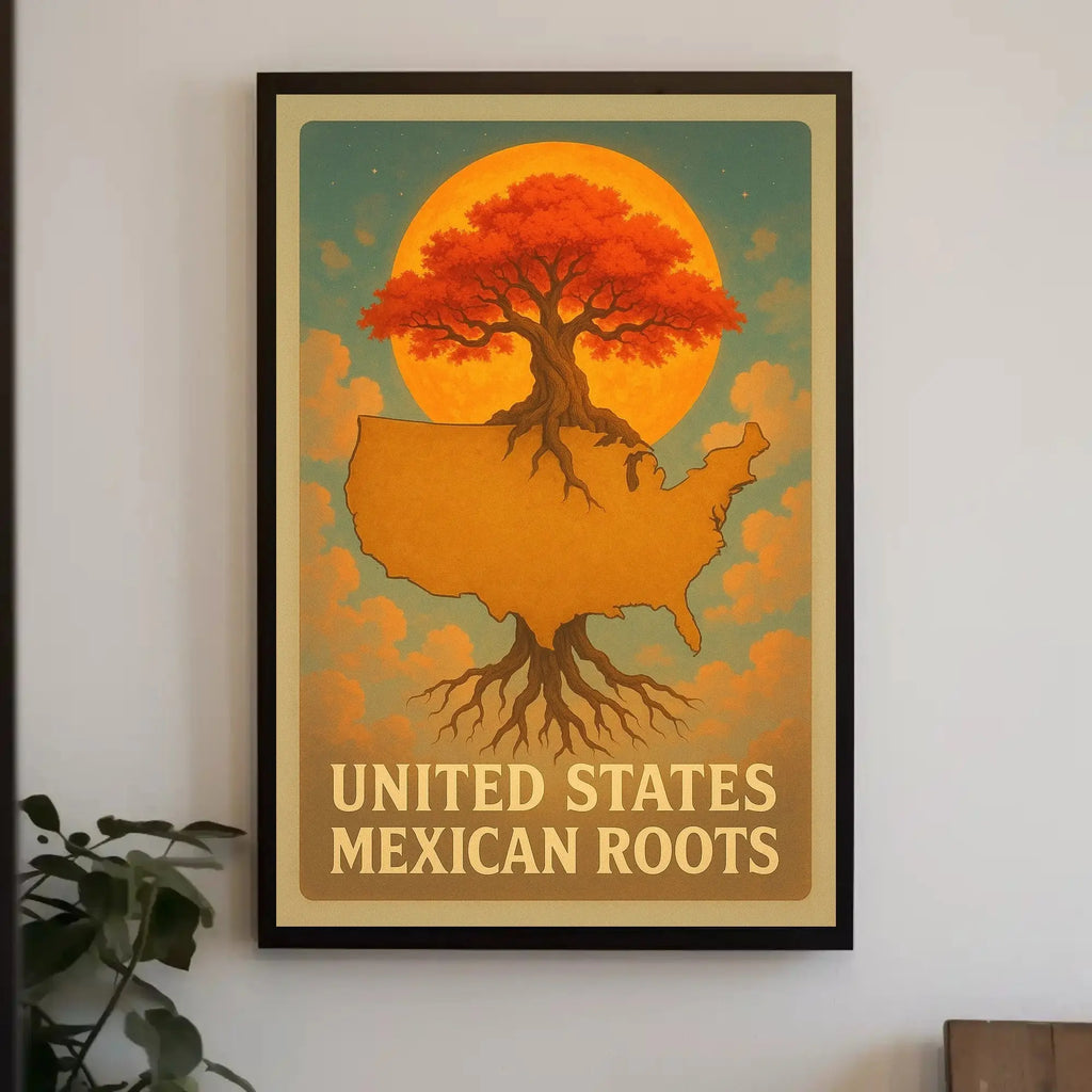 Add a meaningful centerpiece to your home or office with the United States Mexican Roots Cultural Heritage Poster from PosterGoat. This striking art print blends symbolic tree imagery, a warm color palette, and a minimalist line-art aesthetic to celebrate Mexican heritage and cultural connections across the United States. The design features an outline of the USA anchored by a deeply rooted tree with vibrant red foliage set against a glowing celestial backdrop—an evocative piece of cultural art that works beautifully as wall art or heritage decor.