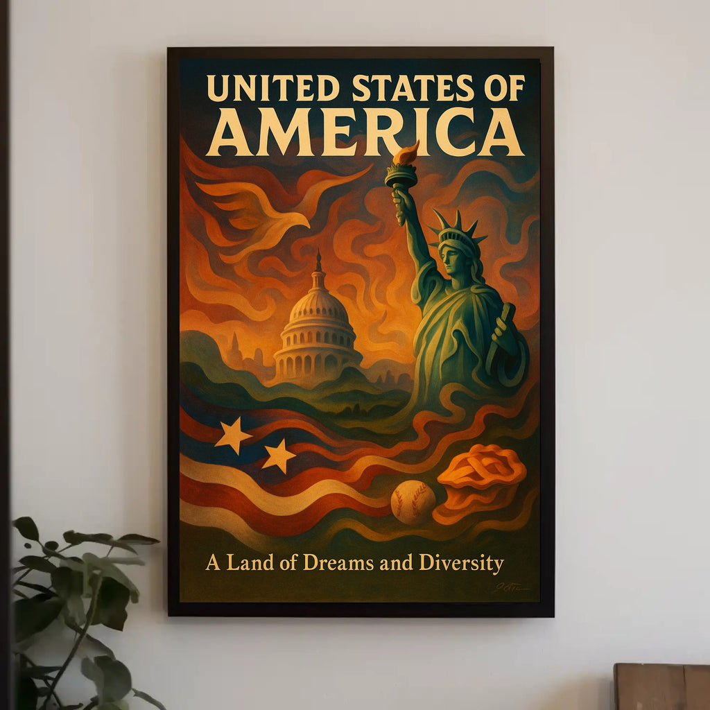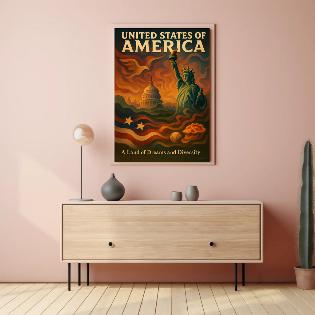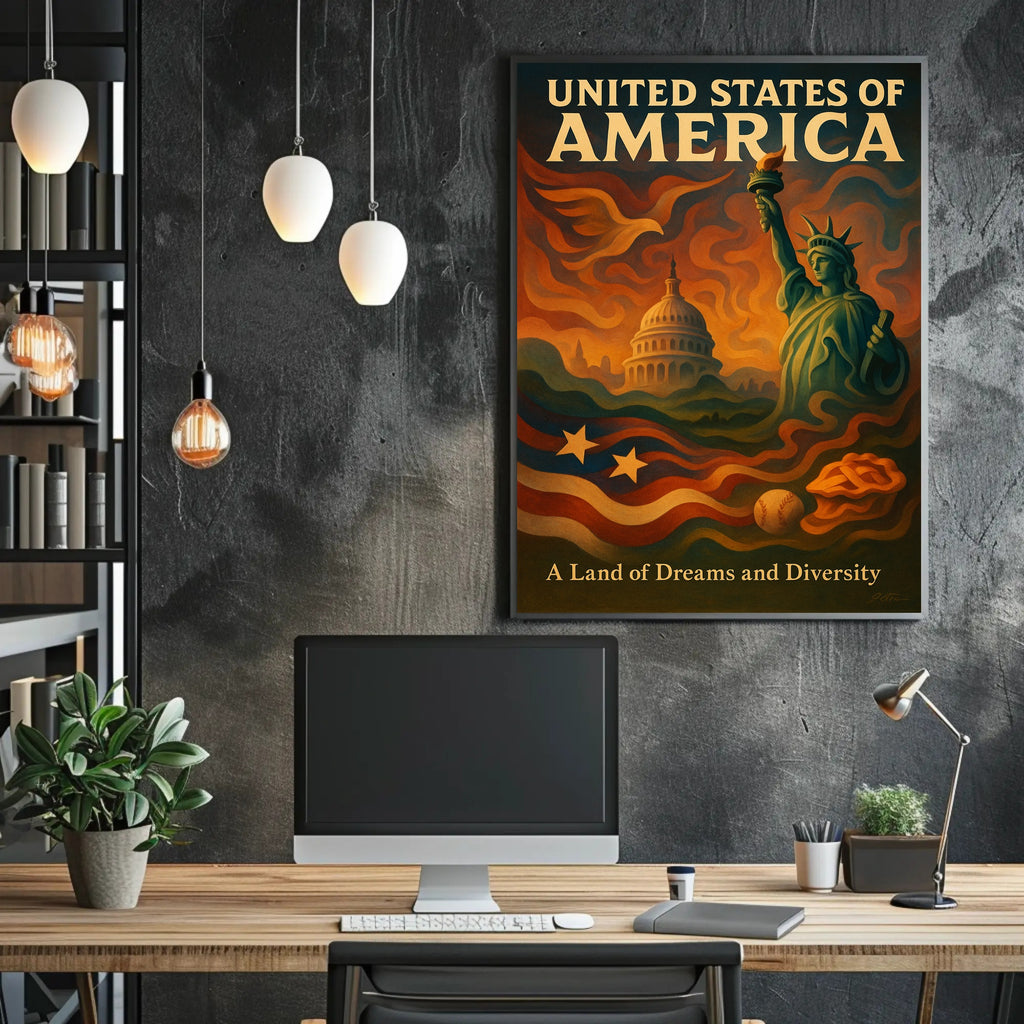 Transform your space with the stunning United States of America A Land of Dreams and Diversity Poster from PosterGoat. This captivating art print encapsulates the essence of America's spirit, showcasing vibrant visuals inspired by real-world scenery. Perfect for decor lovers and wanderlust souls, this poster adds a touch of charm to any room.