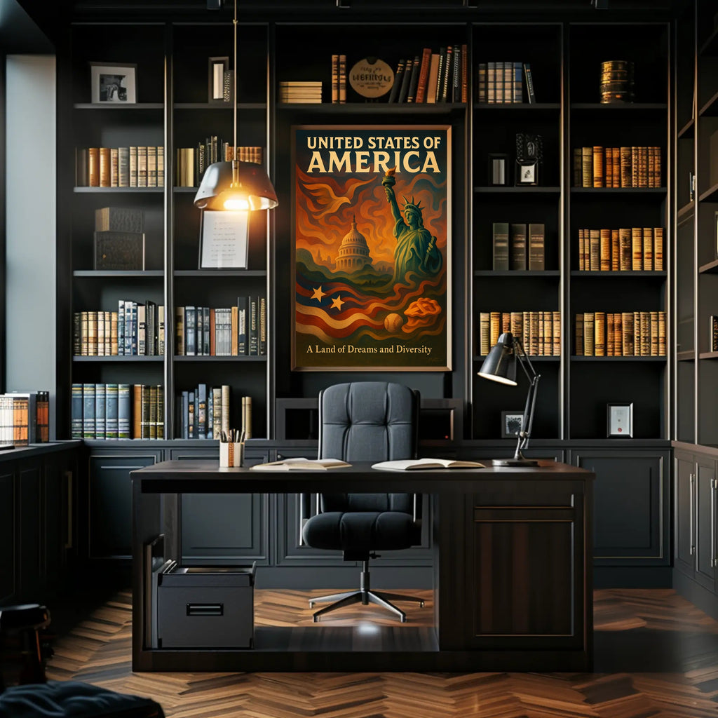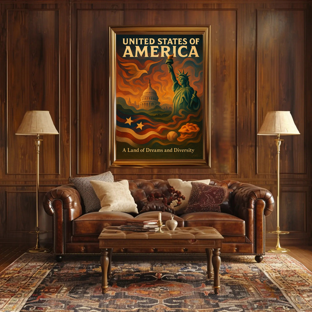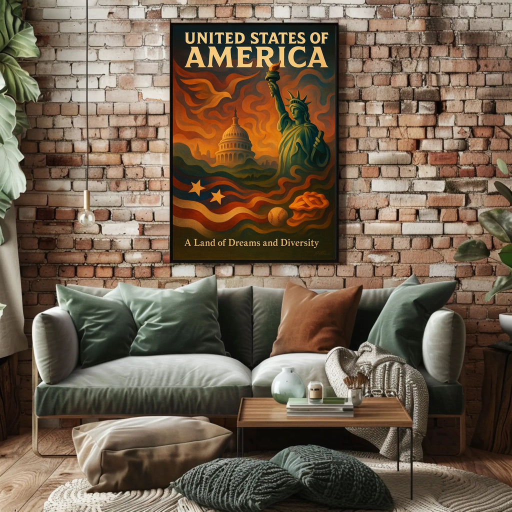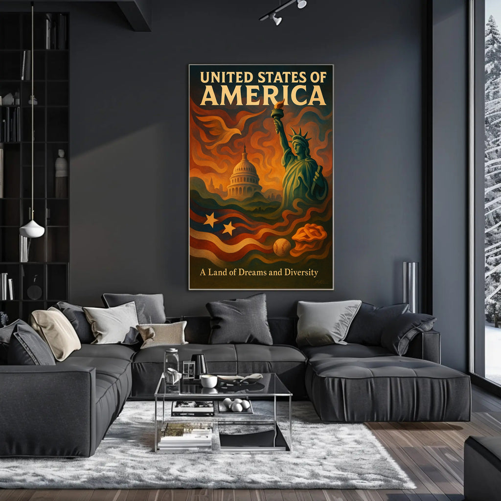 Transform your space with the stunning United States of America A Land of Dreams and Diversity Poster from PosterGoat. This captivating art print encapsulates the essence of America's spirit, showcasing vibrant visuals inspired by real-world scenery. Perfect for decor lovers and wanderlust souls, this poster adds a touch of charm to any room.