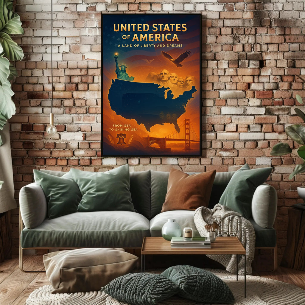 Celebrate the spirit of freedom with the "United States of America — A Land of Liberty and Dreams" poster by PosterGoat. This striking art print pairs a bold navy map silhouette with glowing orange highlights to create a cinematic, minimalist tribute to America's iconic imagery — from the Statue of Liberty and Mount Rushmore to the Golden Gate Bridge and a soaring eagle.