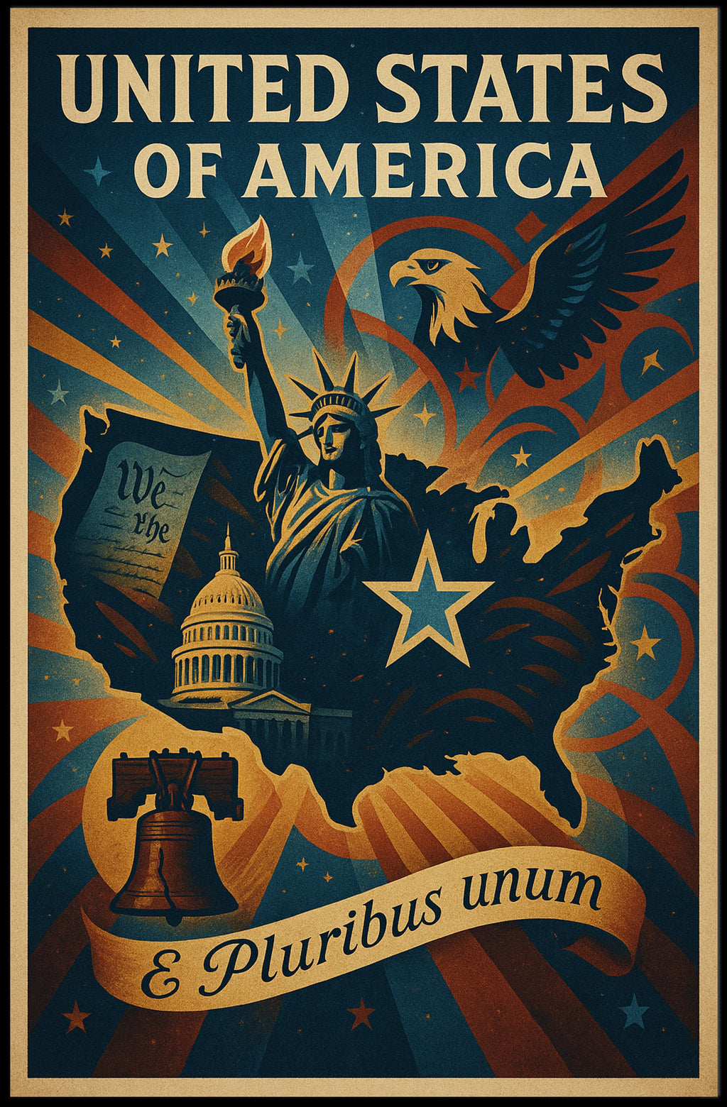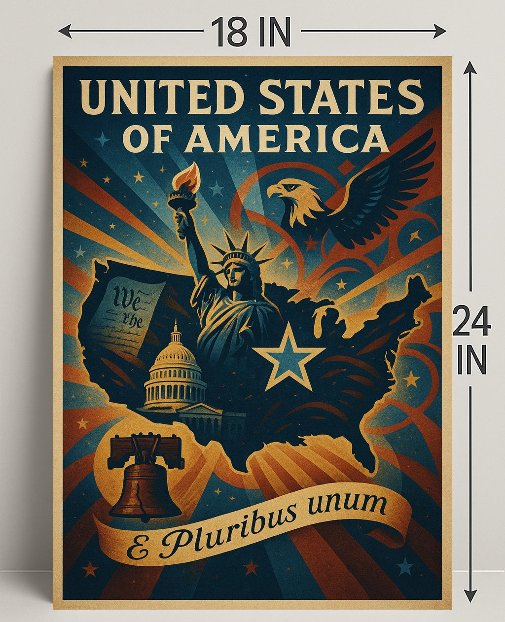 Celebrate American pride with the United States of America E Pluribus Unum Poster from PosterGoat. This vintage-inspired wall art blends bold patriotic icons — the Statue of Liberty, the Capitol dome, the Liberty Bell and a soaring eagle — into a single, striking composition framed by radiant starbursts and a flowing banner that reads “E Pluribus unum.” The retro color palette and textured print deliver an eye-catching focal point for any home, office, or patriotic display.