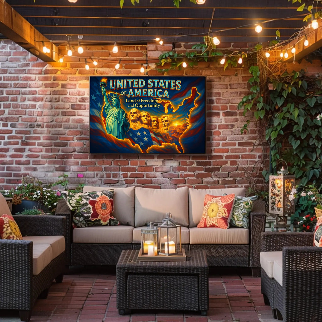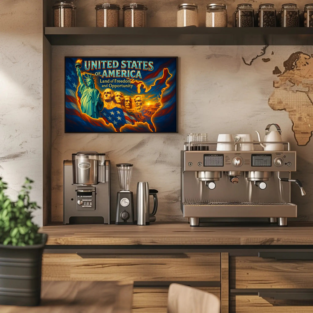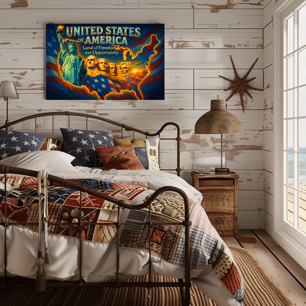 Why you'll love it: This poster blends patriotic symbolism with a warm, luminous palette that energizes any room. The dramatic contrast and nostalgic typography make it an outstanding conversation piece and a memorable gift for travelers, veterans, or fans of Americana art.