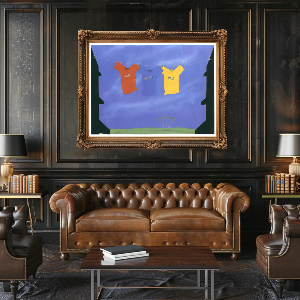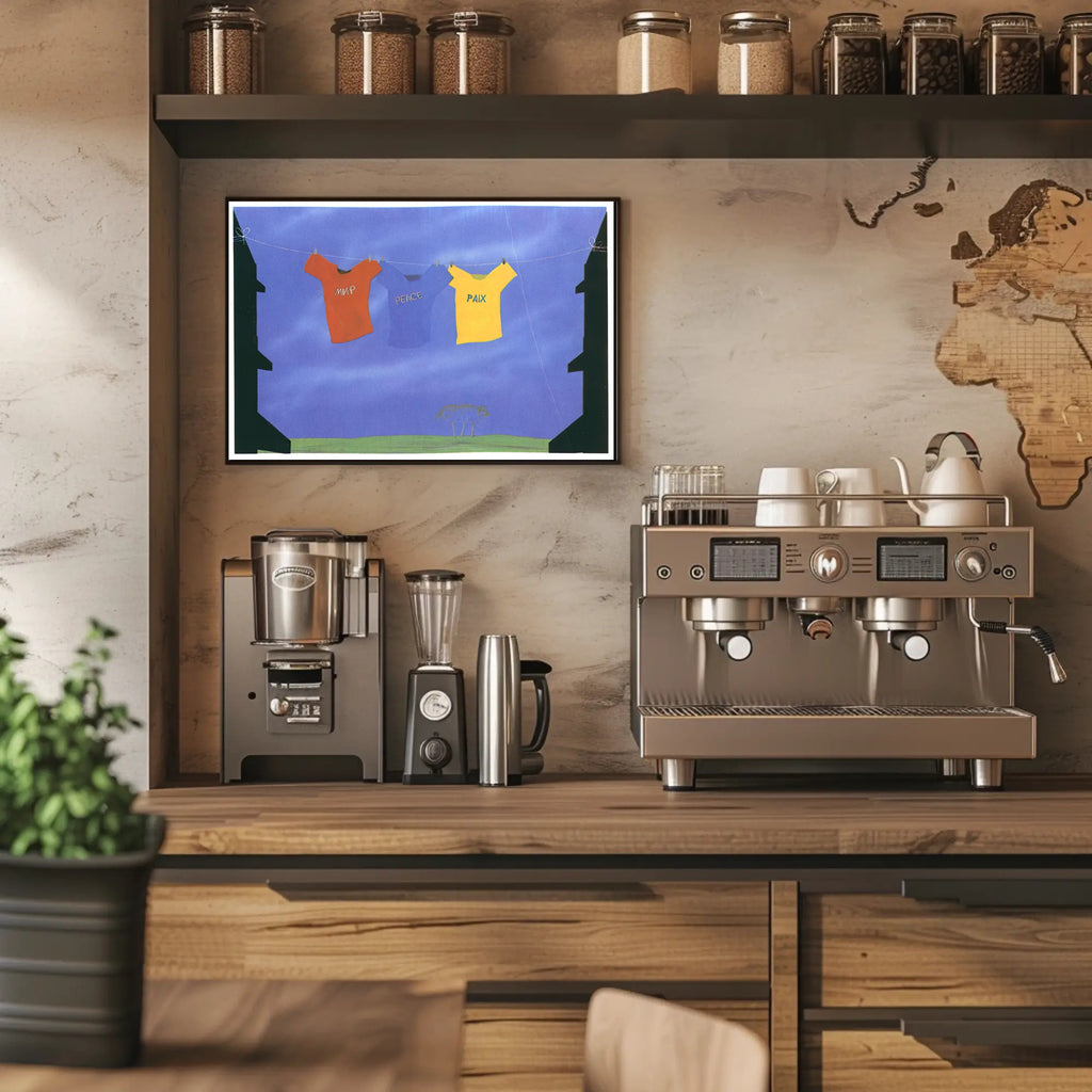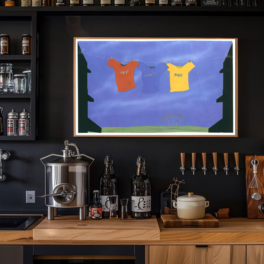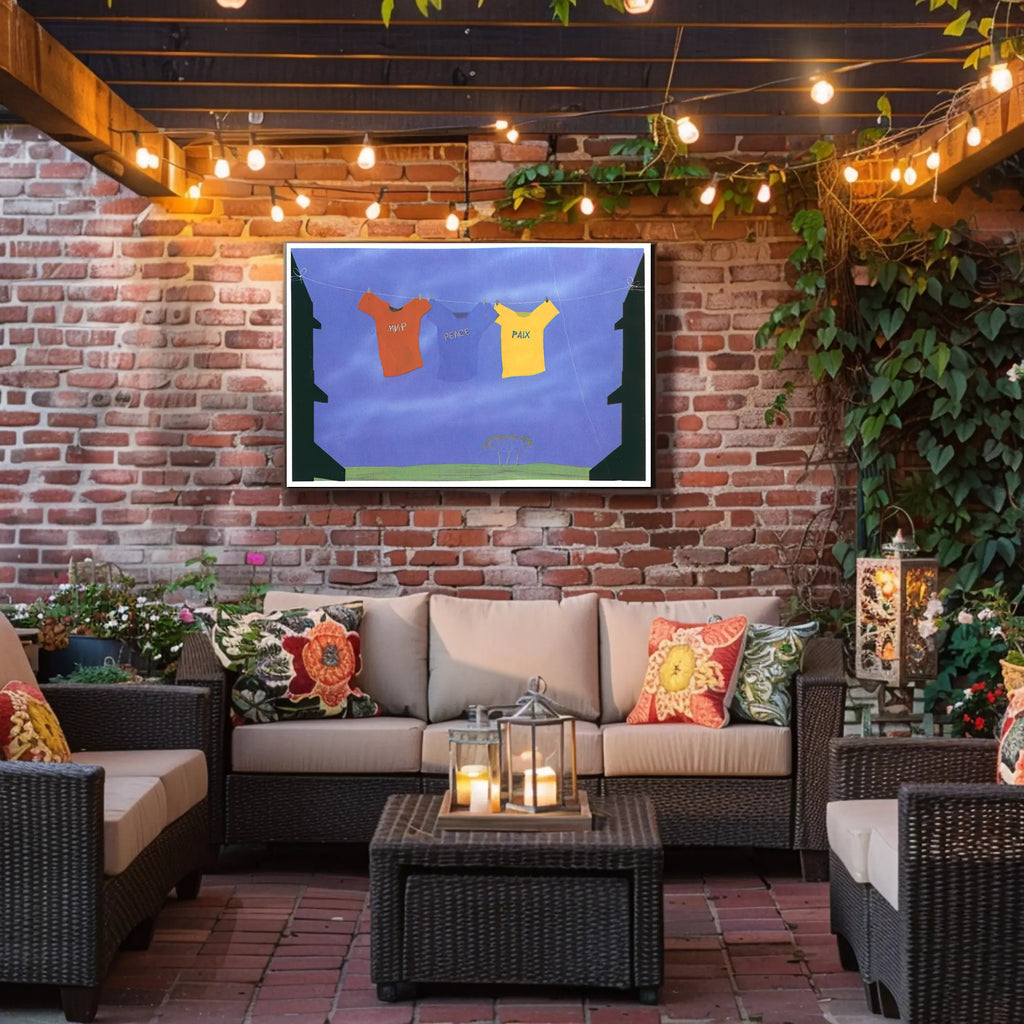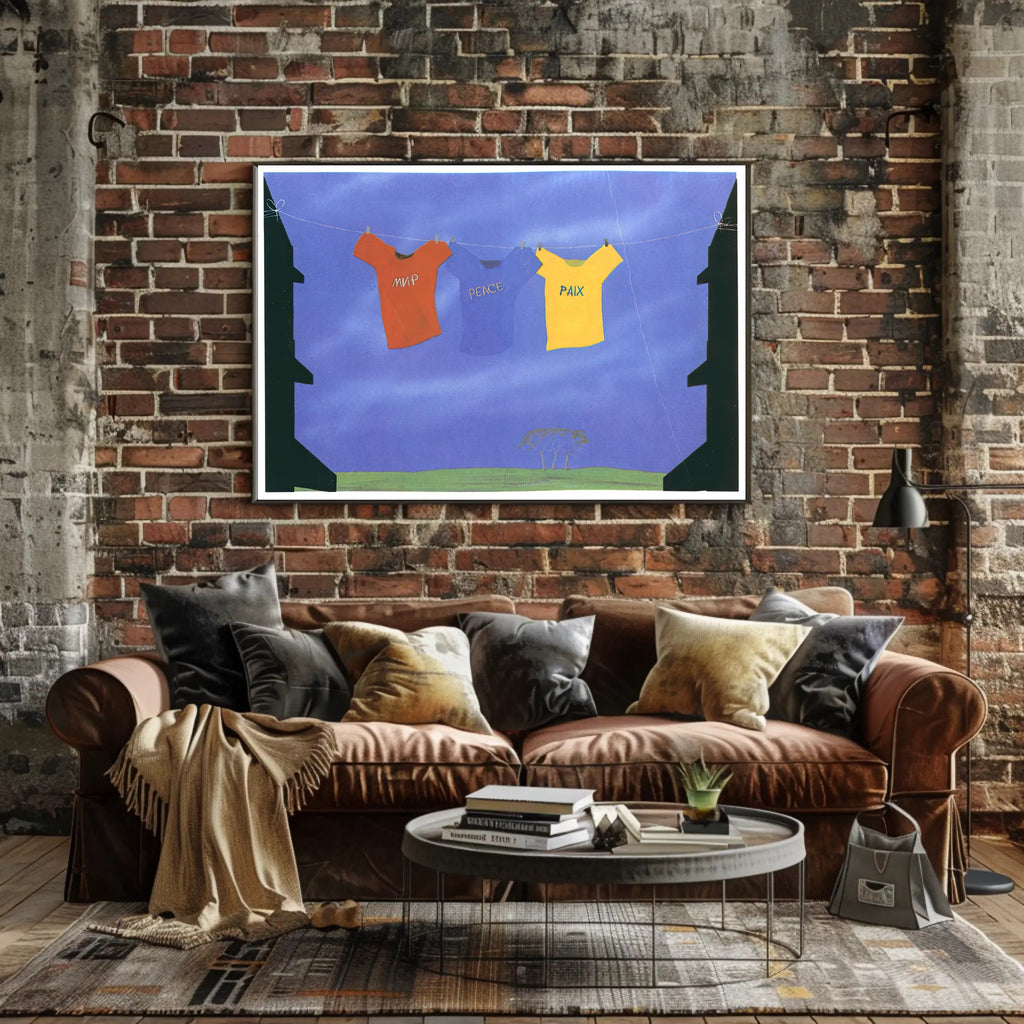Bring a message of harmony to your walls with the Unity Through Peace Poster from PosterGoat. This evocative art print pairs bold, travel-inspired visuals with a calming blue backdrop—three shirts strung across a clothesline spell "peace" in different languages—creating a striking focal point that blends wanderlust with warmth.