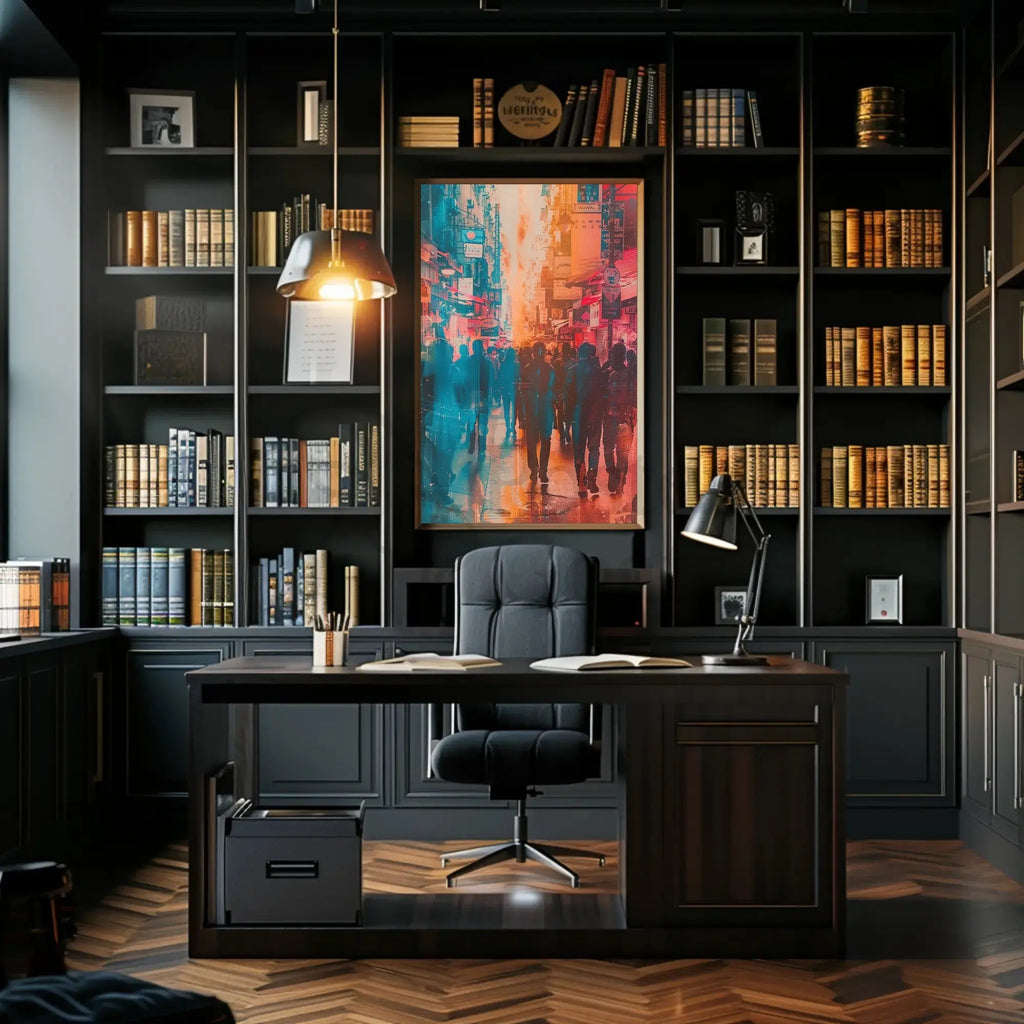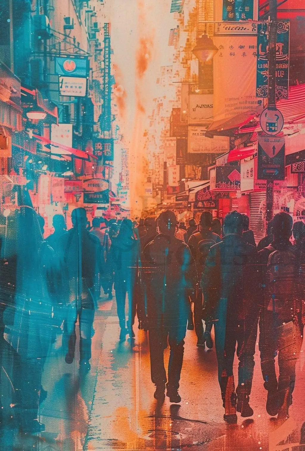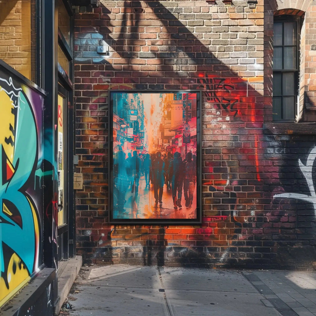 This contemporary cityscape art captures a bustling Asian-inspired street scene where pedestrians become cinematic silhouettes against layers of neon signs and textured color washes. The result is a vibrant, modern art poster that works beautifully as artistic wall decor in living rooms, offices, studios, or hallways.