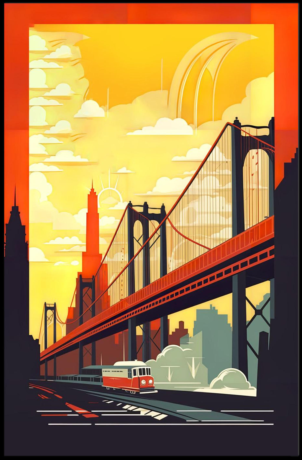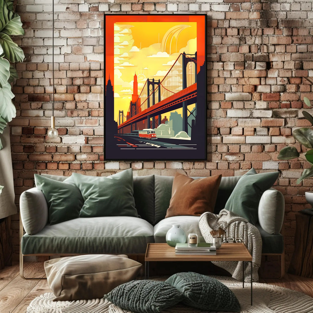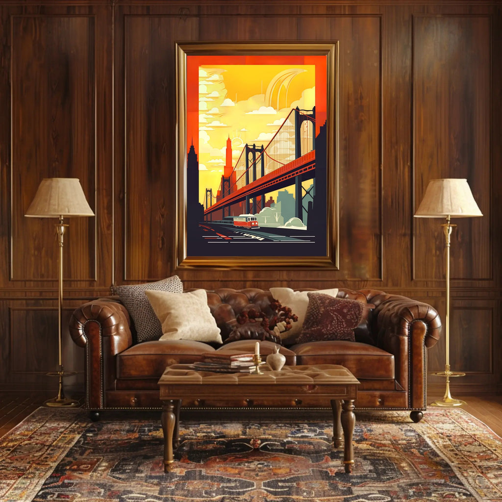 Bring a bold vintage-inspired skyline into your space with the Urban Bridge Art Deco Poster by PosterGoat. This travel-style art print combines sweeping bridge architecture, a sunlit yellow-orange sky and a retro trolley in a crisp Art Deco composition—perfect for decor lovers and wanderlust spirits who want a striking focal point in any room.