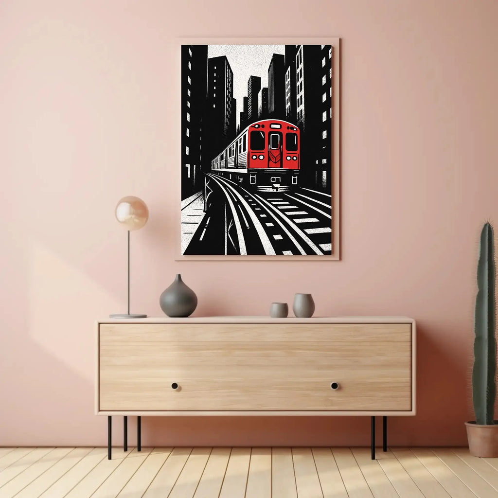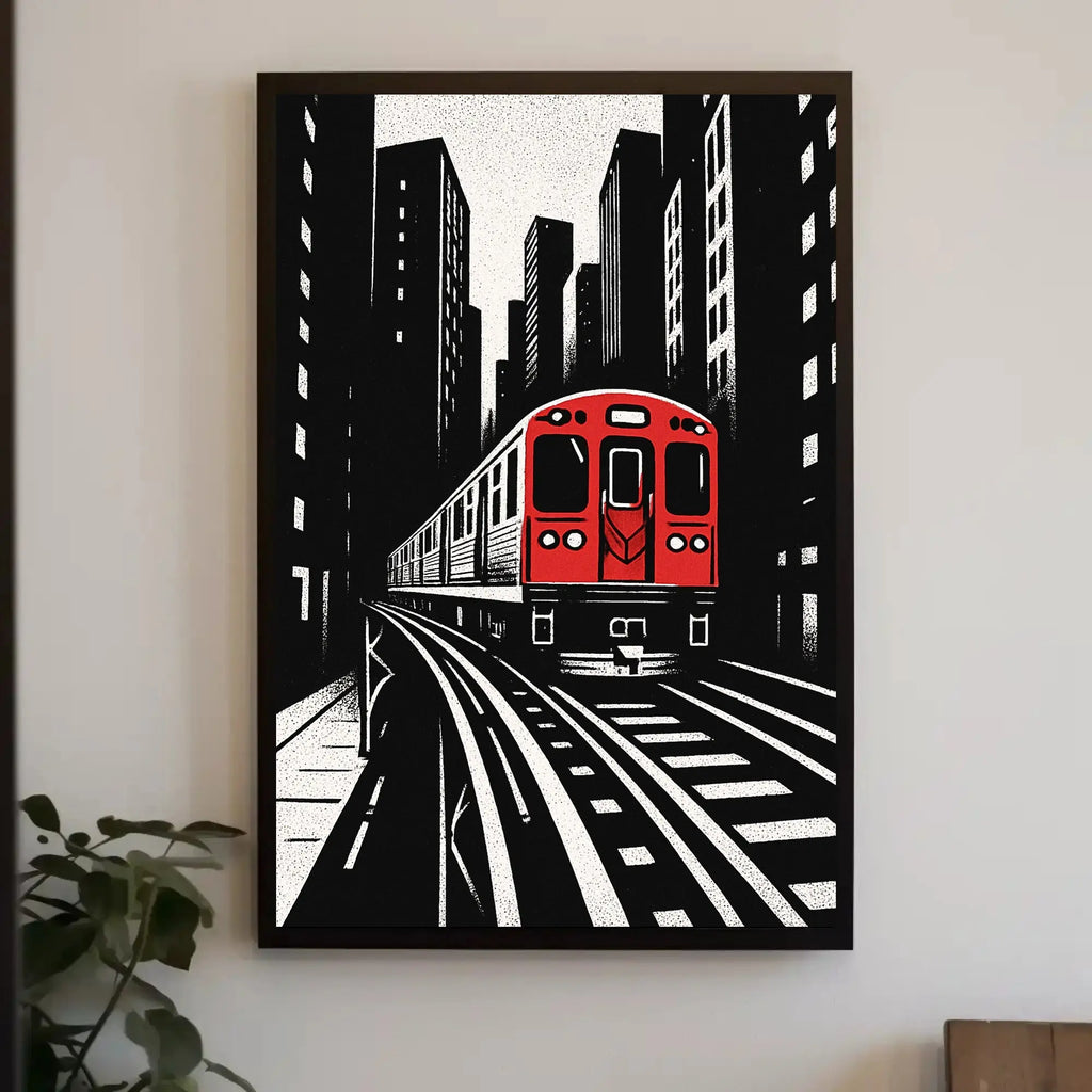 Urban Cityscape Train Journey Art Print from PosterGoat brings bold, metropolitan energy to any wall — an abstract poster that pairs graphic contrast with cinematic perspective. The composition features a striking red train emerging from an elevated track against towering black-and-white skyscrapers, rendered in a textured, linocut-inspired style that reads as both modern and timeless.
