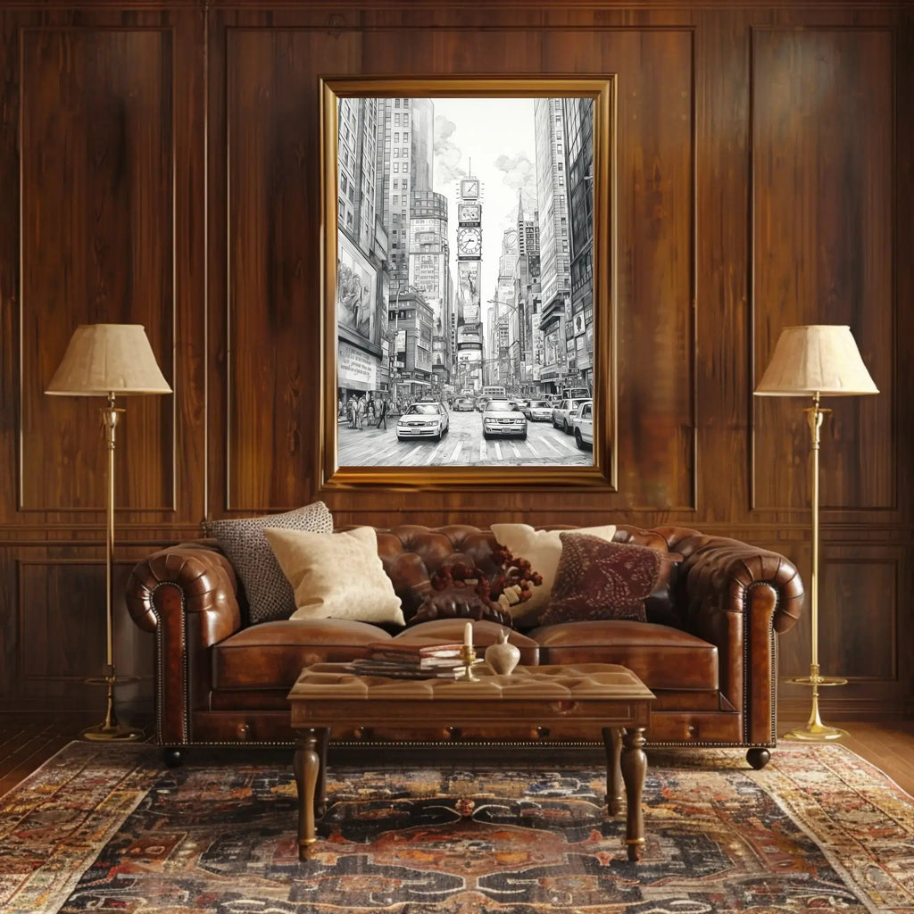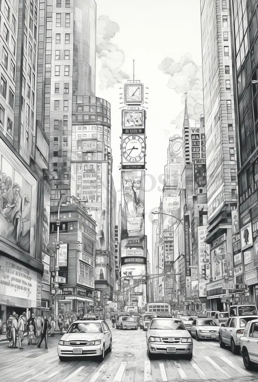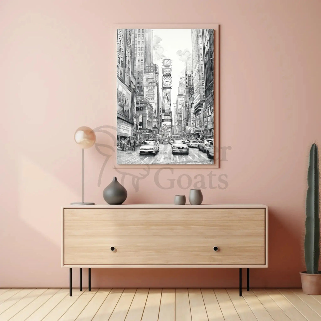 Urban Energy Black and White Sketch Travel Poster from PosterGoat brings the pulse of the city into your home with a finely detailed monochrome sketch that captures bustling streets, towering architecture, iconic signage and rushing taxis in stunning clarity.