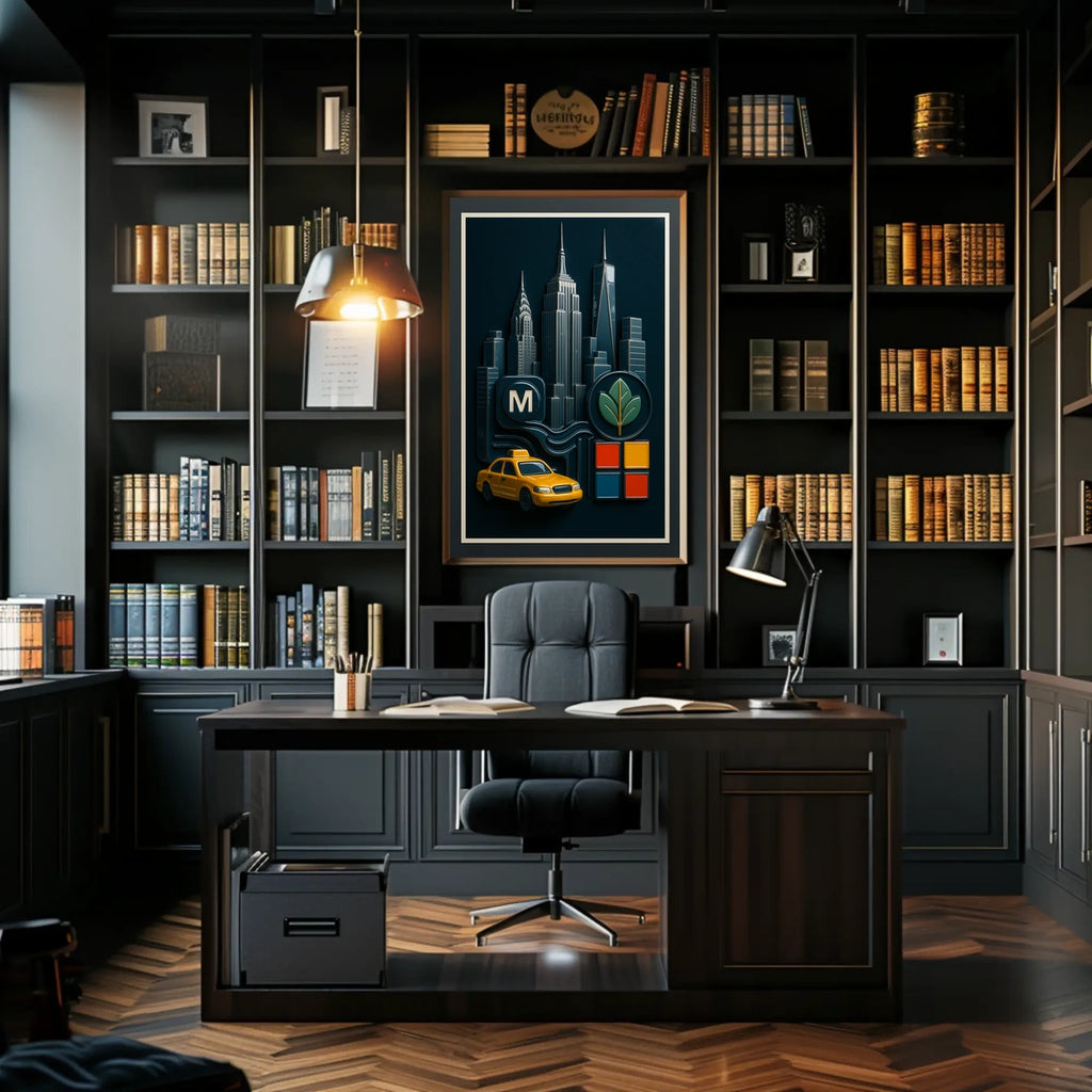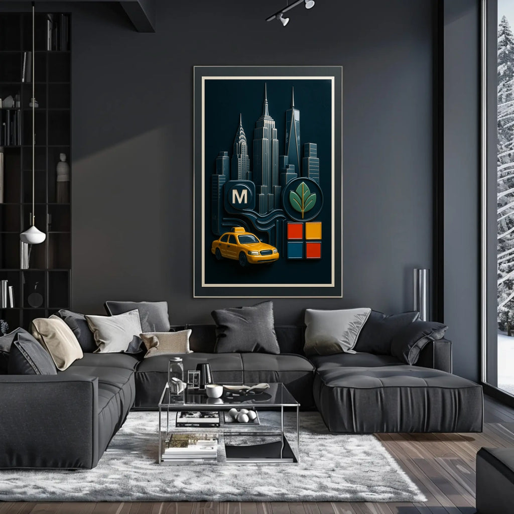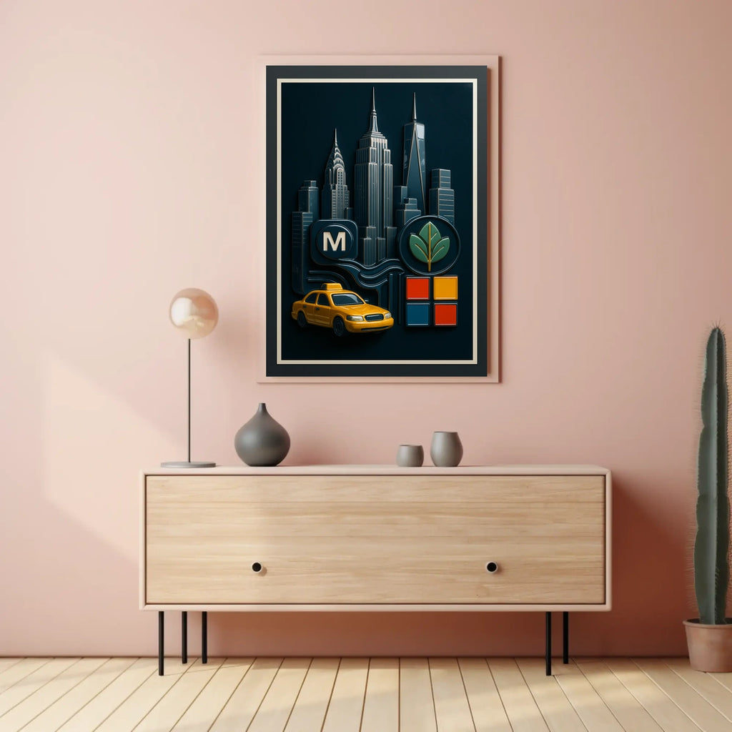 Experience the pulse of urban life with Urban Mosaic: The Essence of a City, a poster that blends iconic skyscrapers, a classic yellow taxi, and nature-inspired details into one vibrant cityscape. This artwork pays homage to architectural energy and the cultural mosaic that makes metropolitan life feel alive.