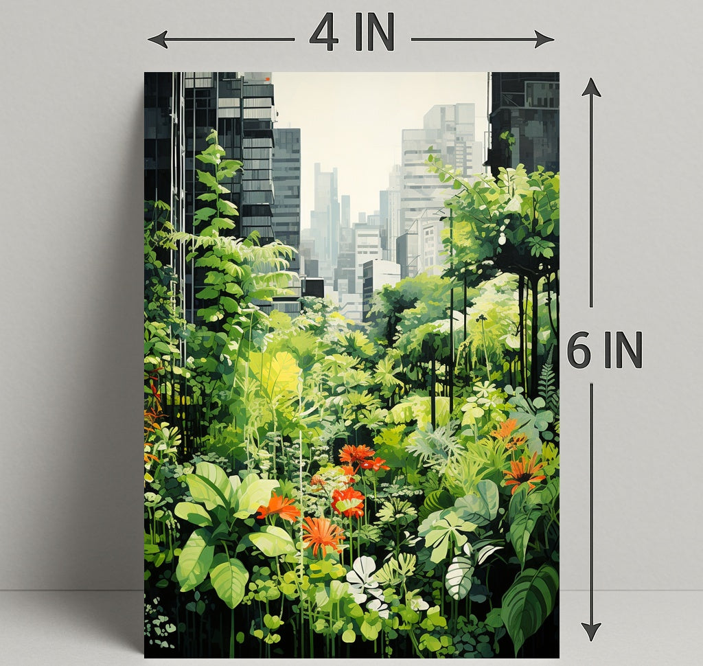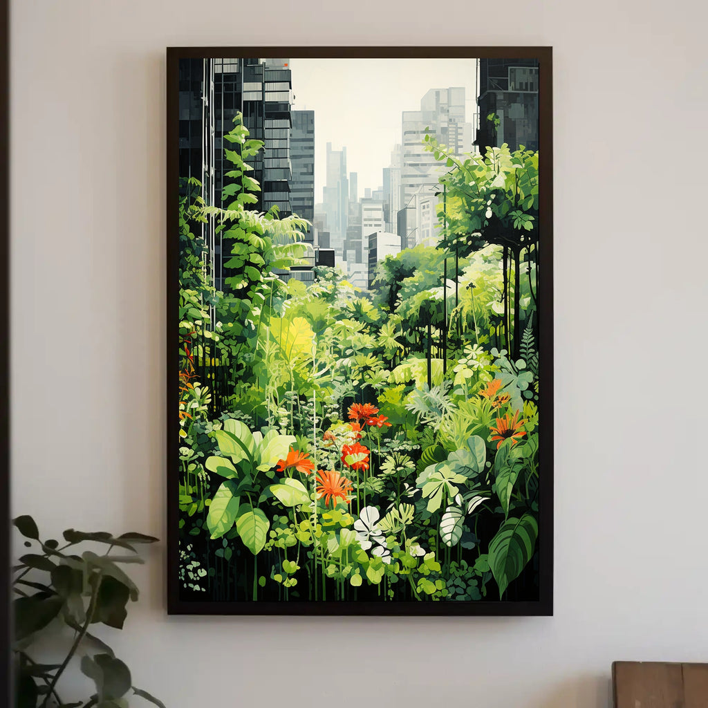 - Striking contrast: vivid greens and pops of orange flowers against muted city buildings deliver depth and visual interest that anchors a living room, office, or hallway.