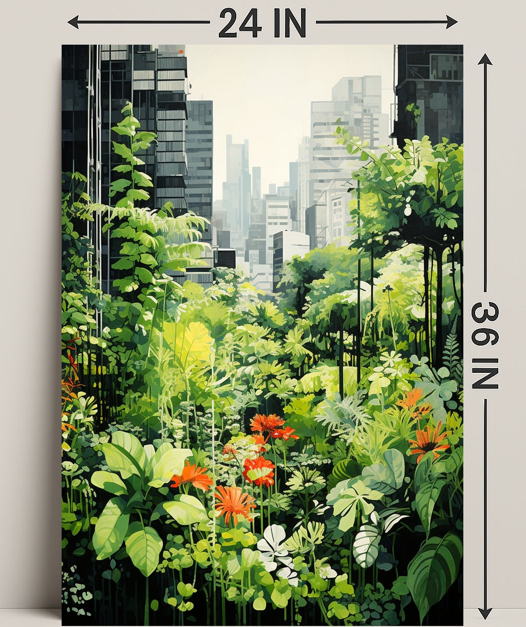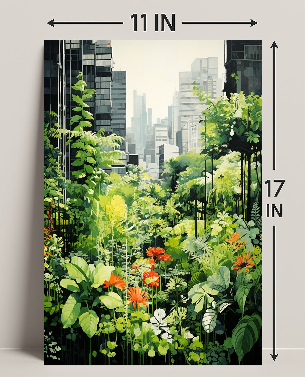 Urban Oasis Poster from PosterGoat brings a breath of fresh air to any room — a vibrant, minimalist print that blends lush greenery and bright wildflowers with a distant urban skyline to create a serene, scenic focal point for modern interiors.