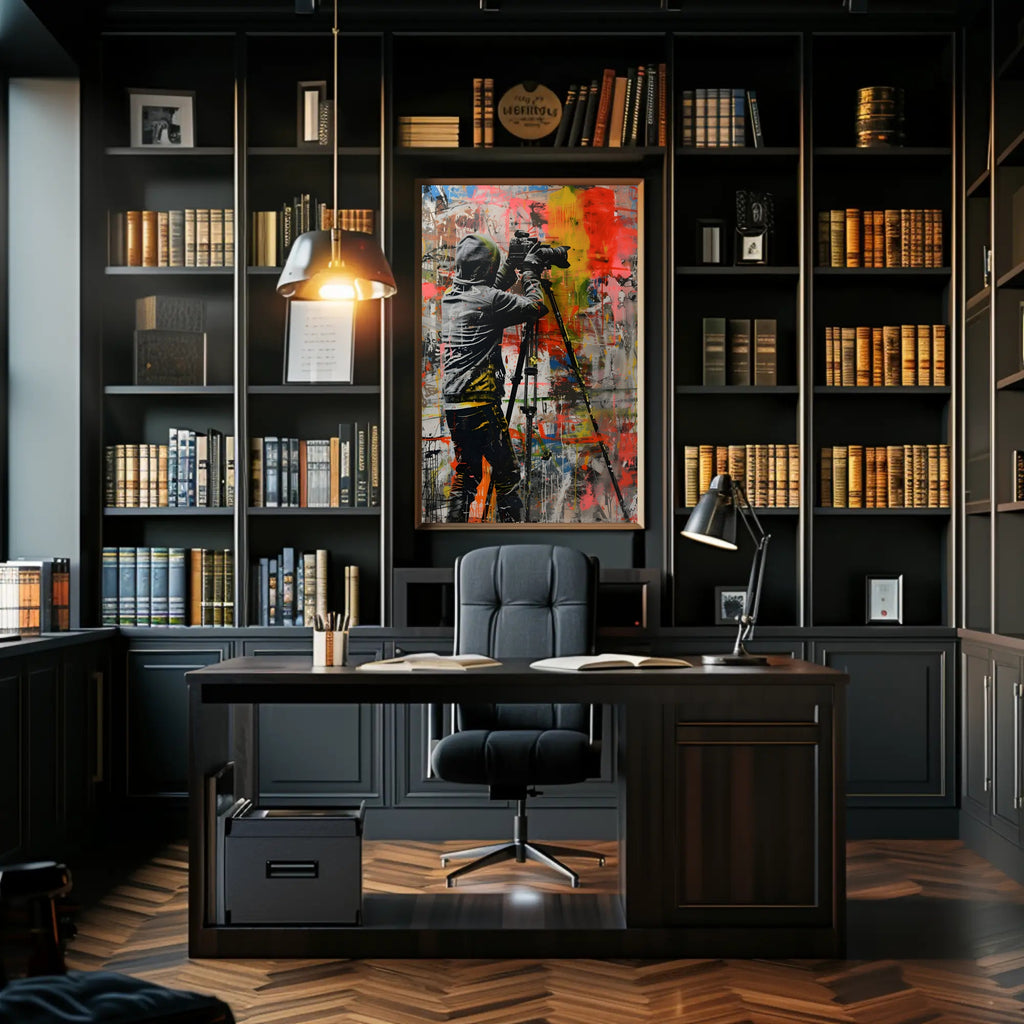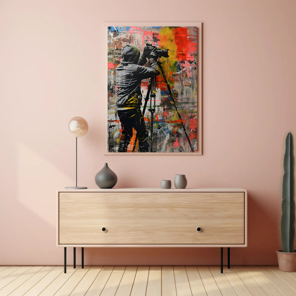 Urban Photography Street Art Poster: A Burst of Creativity from PosterGoat captures the raw energy of the city in a single, striking print — a hooded photographer poised behind a tripod rendered in photorealistic detail against a chaotic, neon-splashed graffiti backdrop.