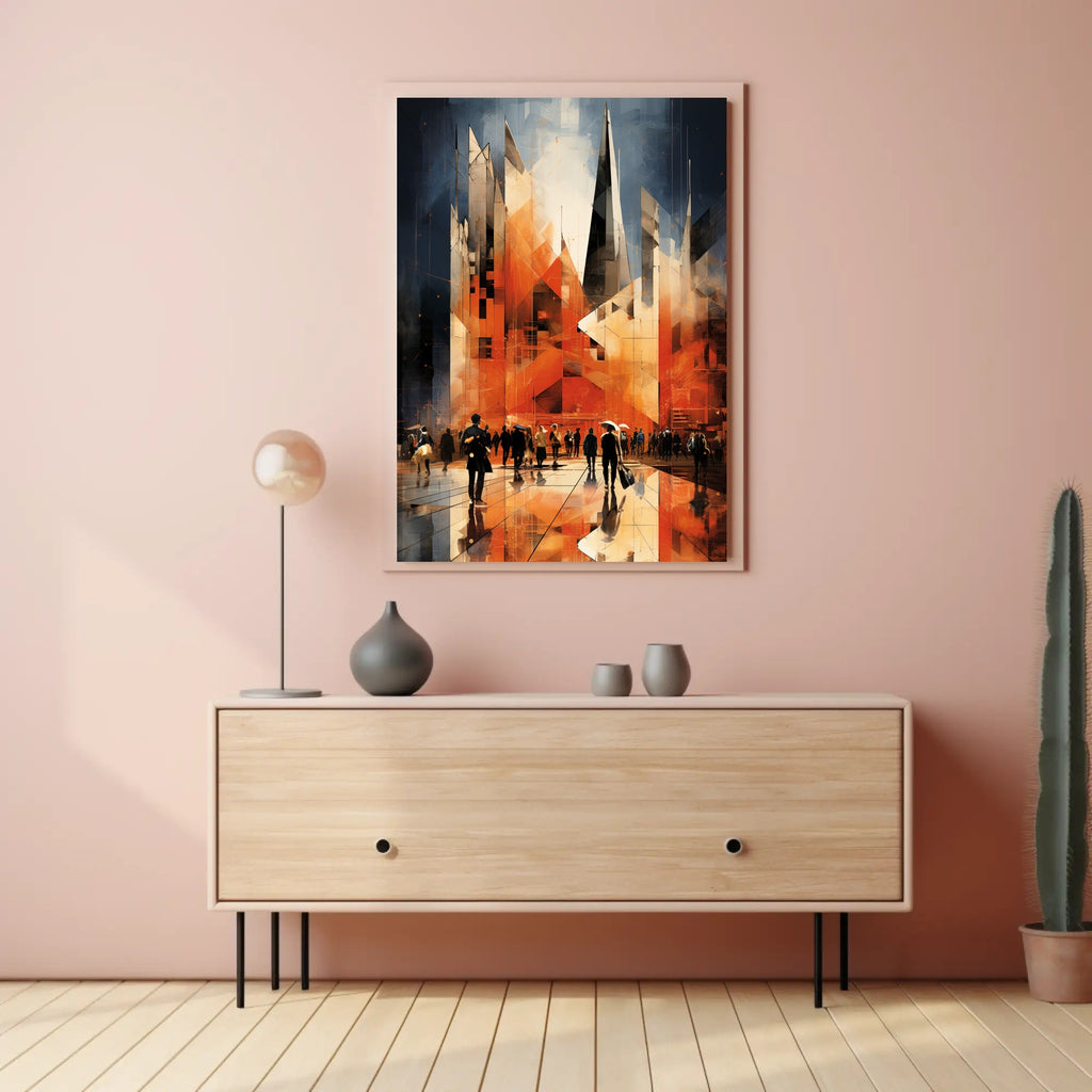 Bold urban design: Abstract, geometric skyscrapers and sharp spires rendered in rich oranges, deep blues and neutral tones to create a dramatic focal point for any room.