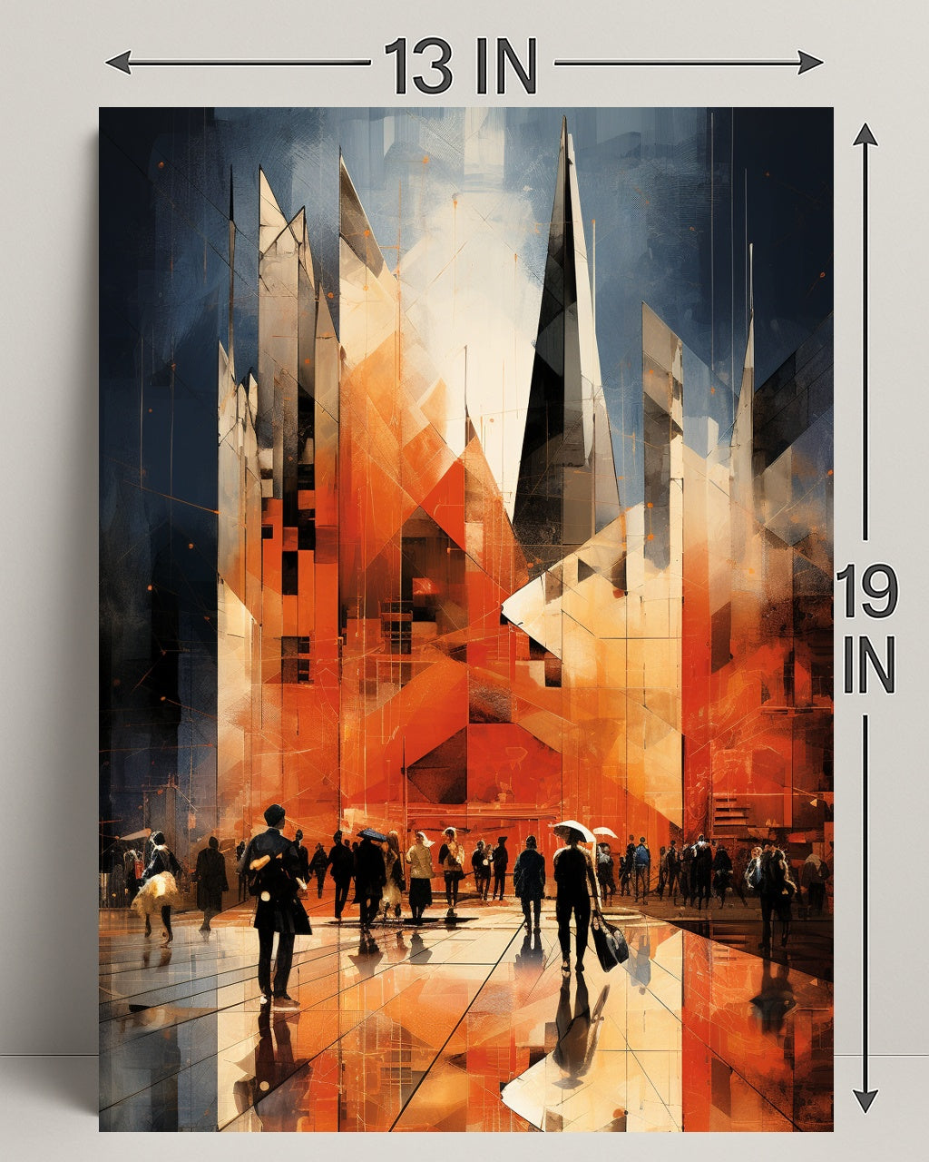 Bring the energy of the city into your home with the Urban Reflections Poster from PosterGoat — a striking minimalist artwork that blends architectural geometry with warm, sunset-like hues and mirror-sharp reflections. This high-impact poster captures towering, angular skyscrapers, bustling silhouetted pedestrians and a glossy plaza that doubles the scene, creating depth and movement that draws the eye.