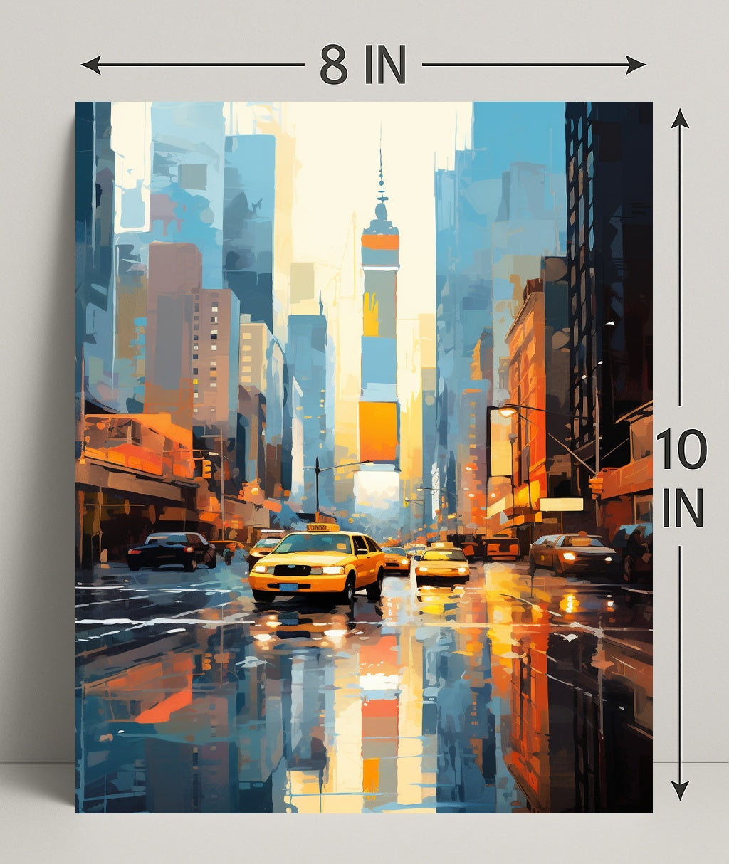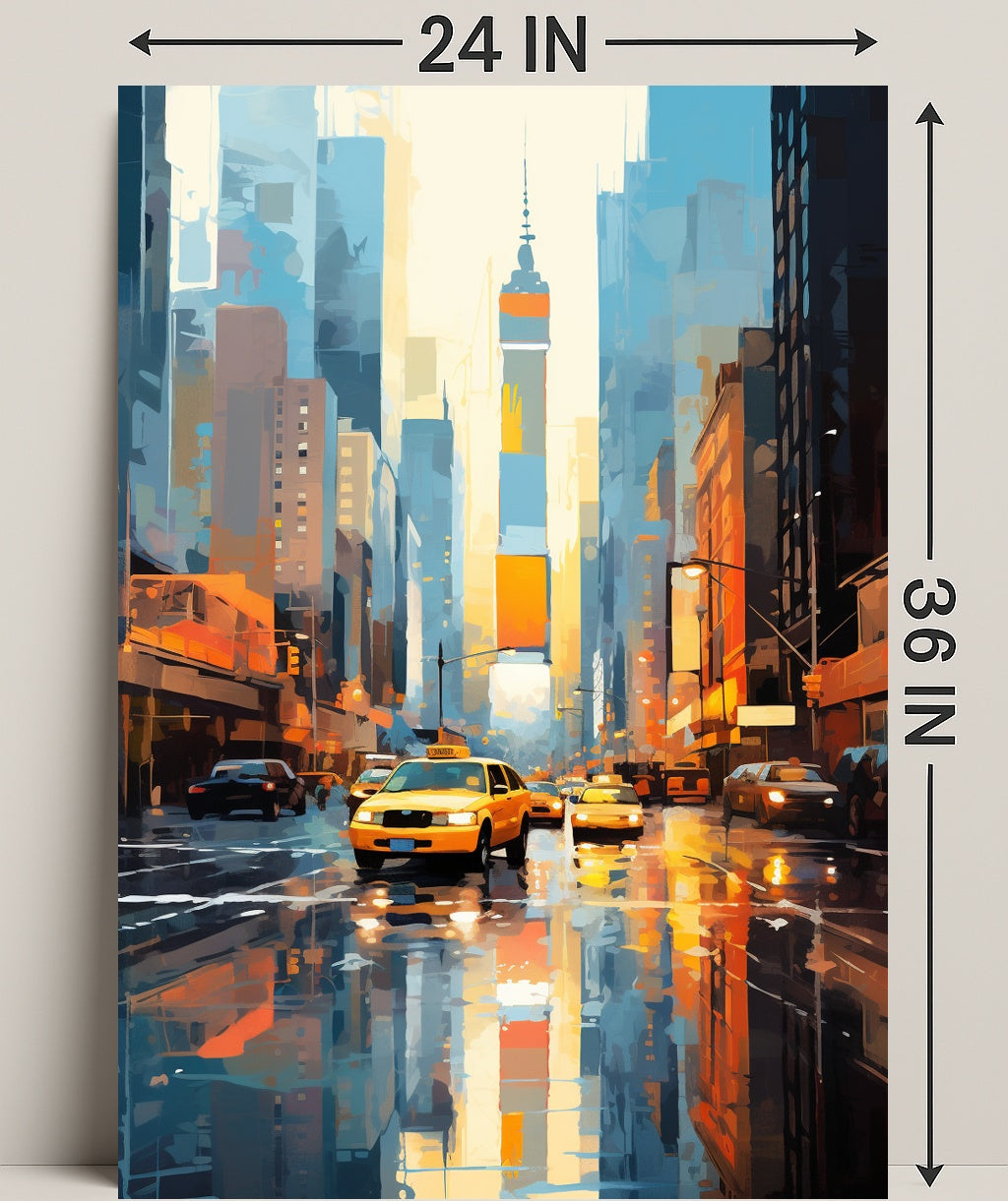 Elevate your space with the Urban Reflections Poster from PosterGoat — a stunning piece of modern wall art that captures the pulse of the city in vibrant color and cinematic reflection. This captivating poster blends bold, painterly brushstrokes with crisp, minimalist composition to create a scenic urban tableau: yellow taxis cutting through rain-slick streets, towering skyscrapers, and luminous reflections that double the drama of the scene.