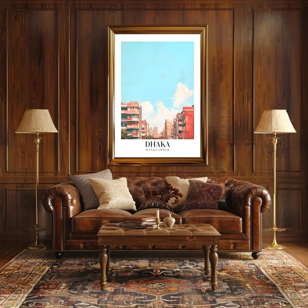 This poster belongs to the Home & Garden > Decor > Artwork > Posters category and pairs beautifully with minimalist, mid-century modern interiors. It also works well as a thoughtful gift for lovers of Bangladesh art, contemporary urban art, or cityscape posters.