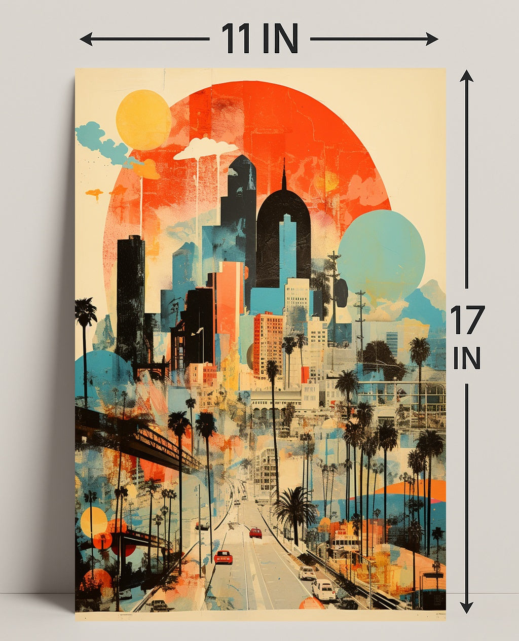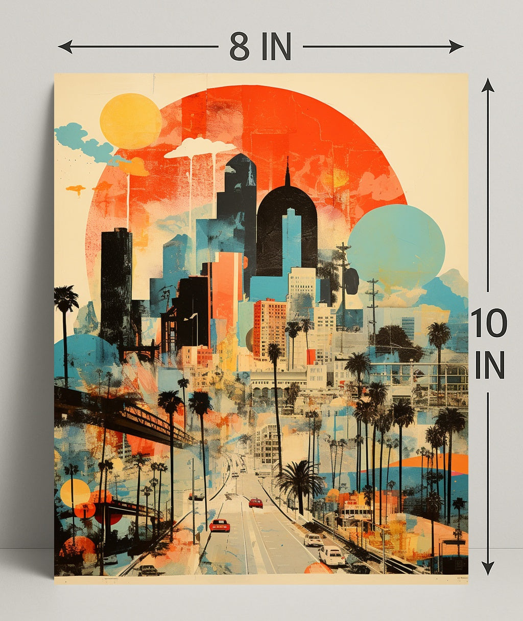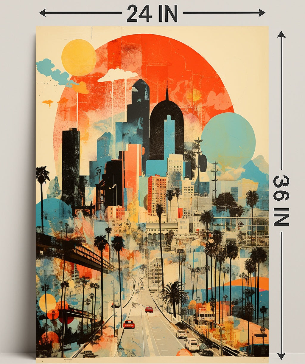 Artful city narrative: Collage-style layers of skyscrapers, palm trees and overpasses combine scenic travel vibes with modern art aesthetics.