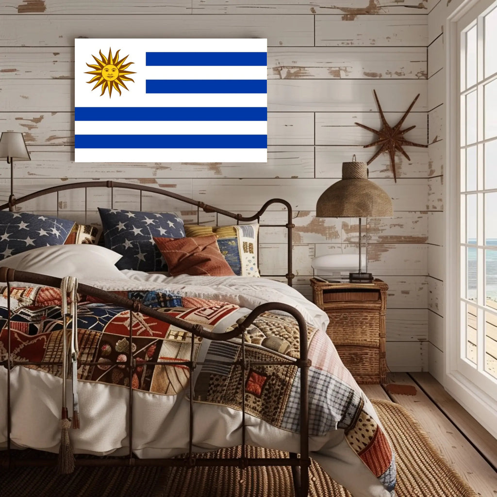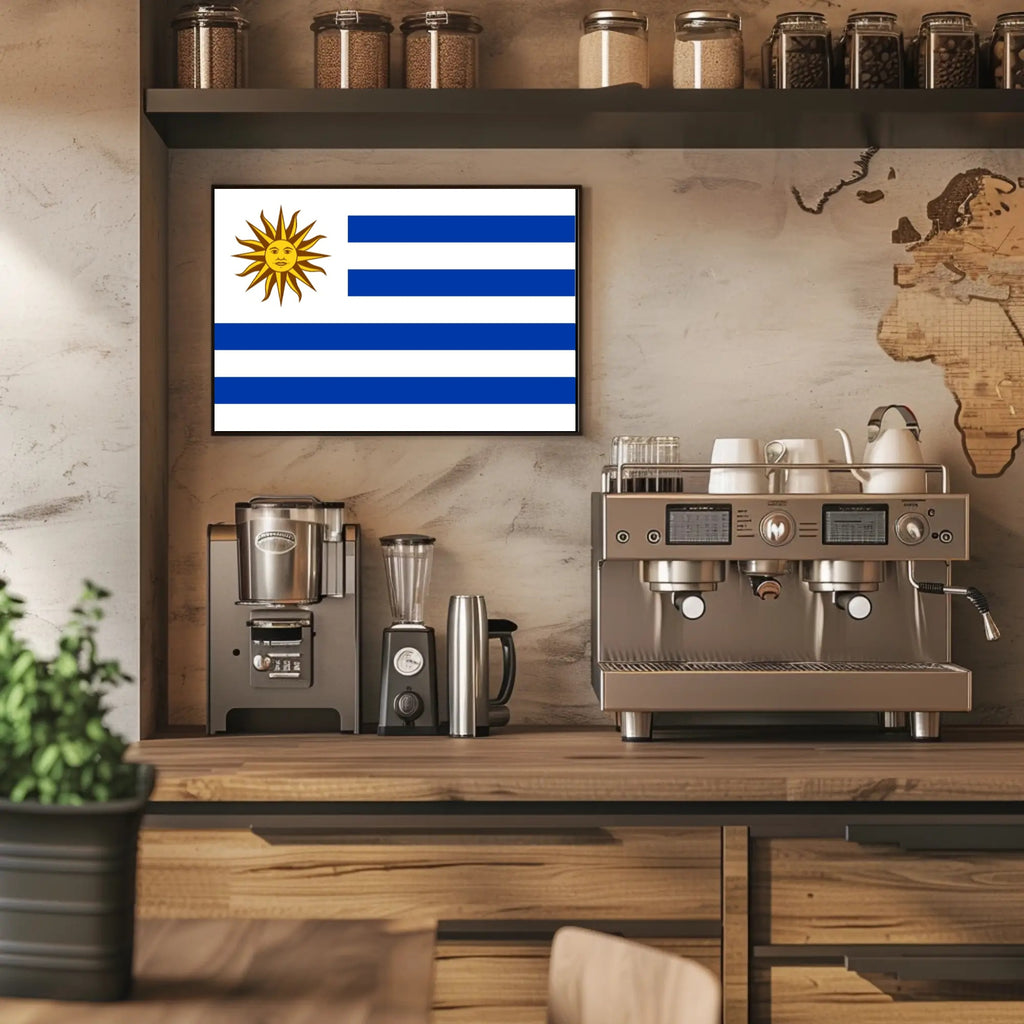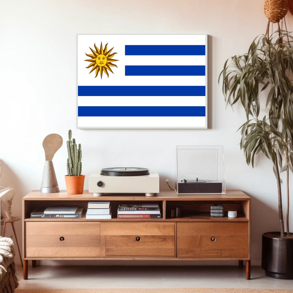 This poster pairs beautifully with brick, concrete, or neutral walls as shown in staged images, adding a splash of national pride without overpowering existing decor. The simplified composition and bold geometry make it a versatile piece for living rooms, studies, cafes, or community spaces honoring Uruguayan culture and history.
