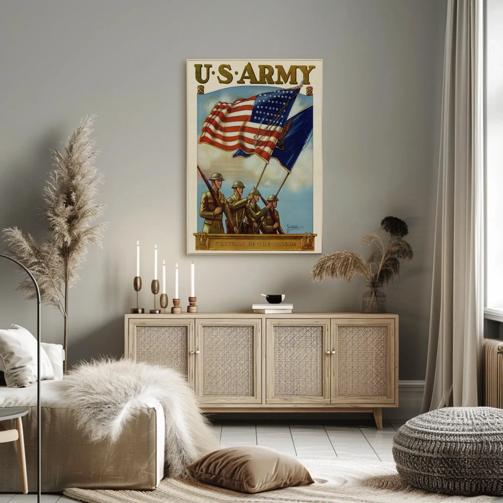 This striking vintage poster pays homage to the valor and dedication of the U.S. Army during World War I. It vividly portrays four soldiers marching with unwavering pride, donned in authentic World War I military uniforms, and carrying the American flag high. The artwork is meticulously detailed, showing lifelike expressions and attire, set against a backdrop of a clear blue sky. Bold, gold lettering reading "U.S. ARMY" reinforces the theme of strength and duty. The nostalgic style captures a deep sense of honor and nationalism, making it a perfect piece for those who appreciate military history and patriotic pride.