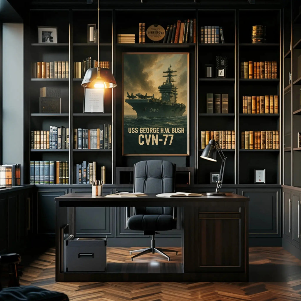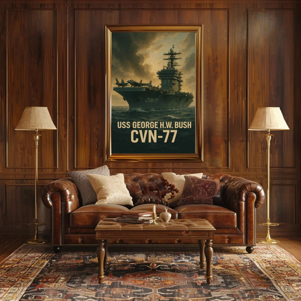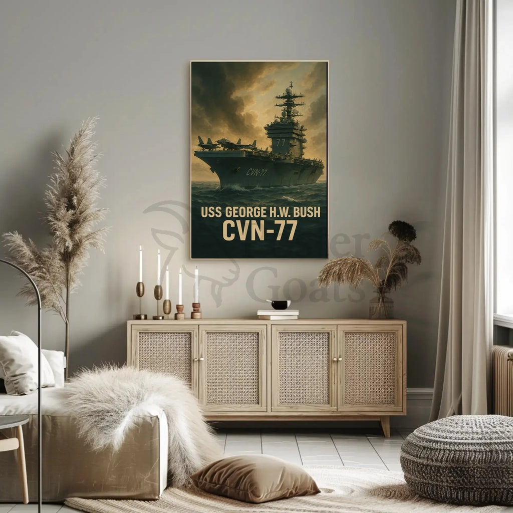 This poster blends gritty, sepia-toned realism with bold, vintage typography to create a commanding focal point for any room. The carrier's deck, complete with fighter jets and the prominent "CVN-77" hull marking, is rendered in high detail to honor naval history and modern military aviation.