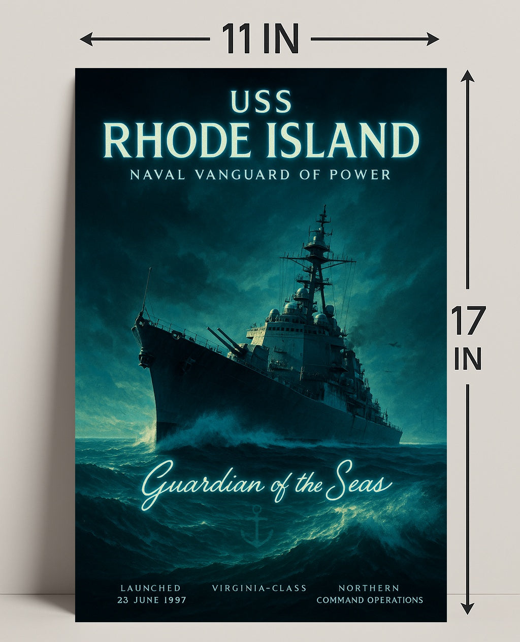 Bring the power and mystery of the high seas into your home with the USS Rhode Island — Guardian of the Seas poster from PosterGoat. This dramatic maritime artwork captures a Virginia‑class warship cutting through stormy waves beneath a brooding teal sky, making it a statement piece for any Posters, Prints & Visual Artwork collection in Home & Garden decor.