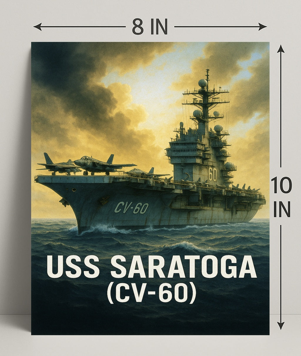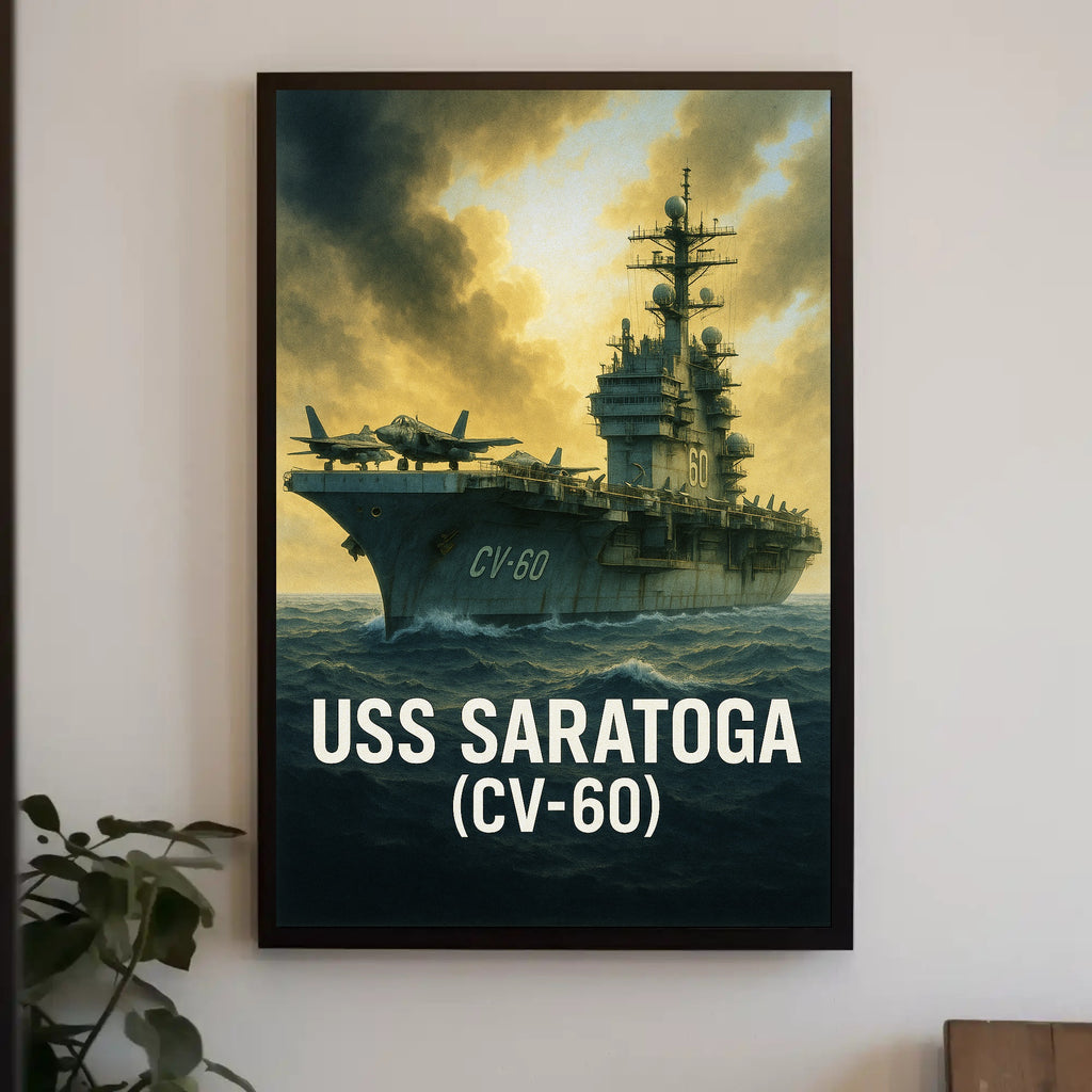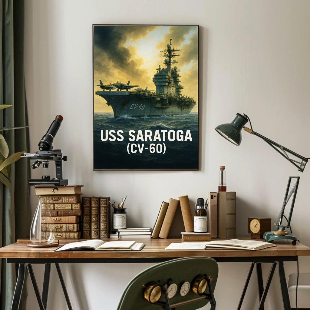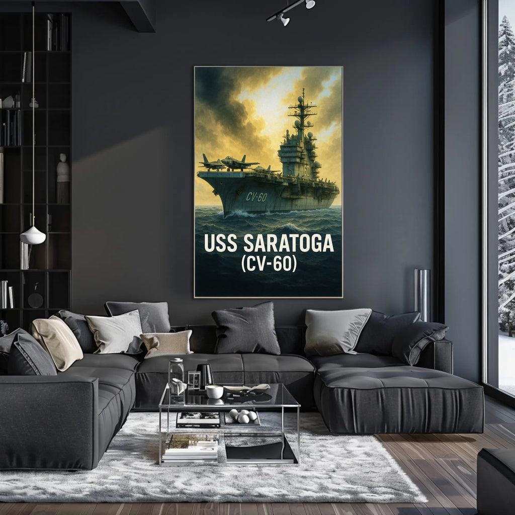 Striking imagery: Photorealistic illustration of the USS Saratoga (CV-60) with detailed flight deck, visible aircraft silhouettes and the bold "CV-60" hull marking—designed to draw the eye and anchor any room.