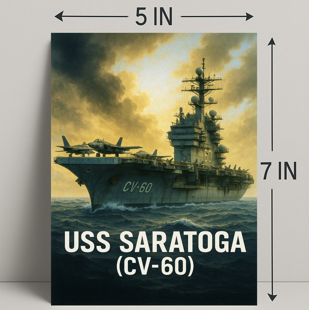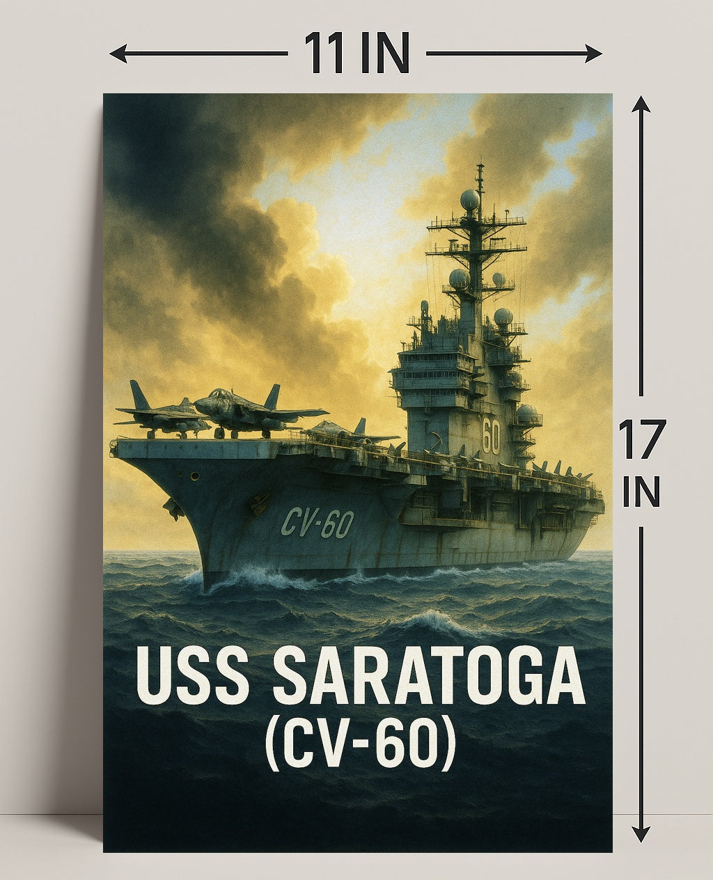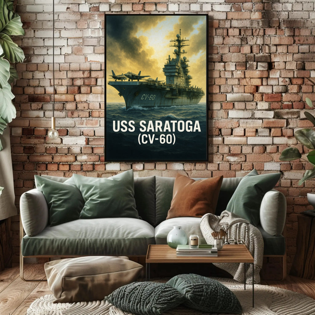 Striking imagery: Photorealistic illustration of the USS Saratoga (CV-60) with detailed flight deck, visible aircraft silhouettes and the bold "CV-60" hull marking—designed to draw the eye and anchor any room.
