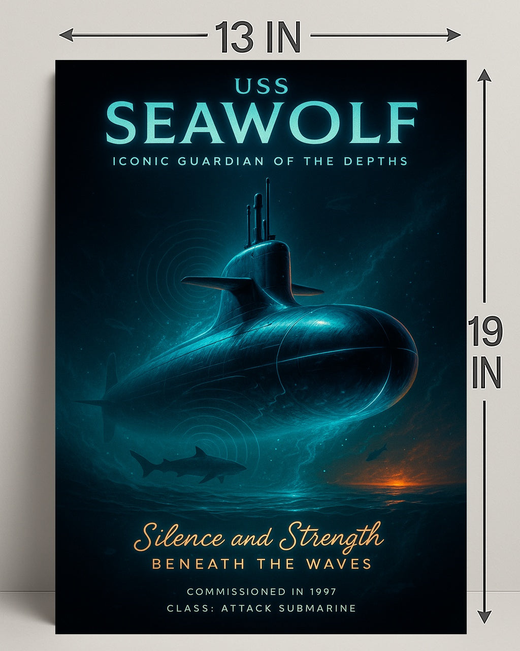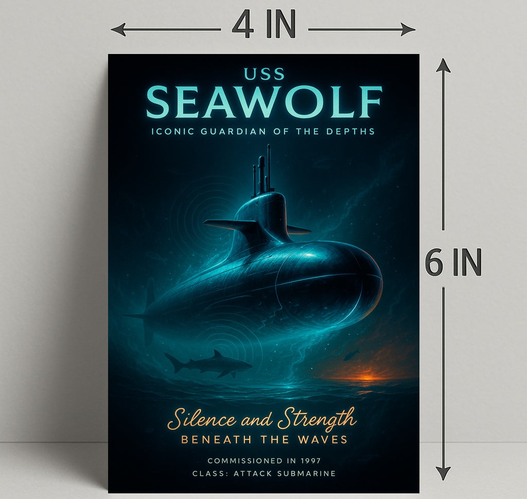 - Design details that tell a story: Includes evocative copy — “Silence and Strength • Beneath the Waves” — with metadata nods like “Commissioned in 1997” and “Class: Attack Submarine,” giving the piece authenticity and narrative depth.