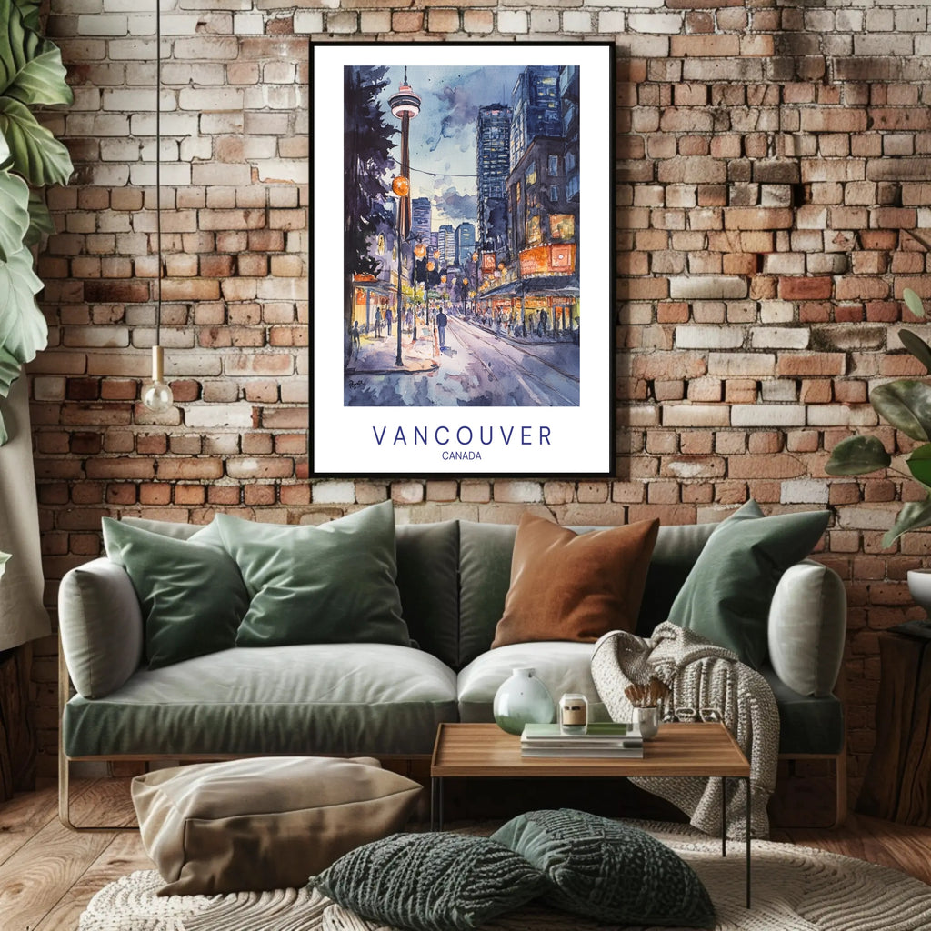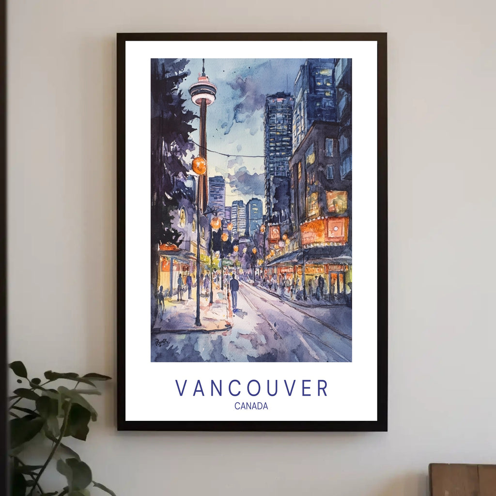 Bring the magic of Vancouver's evening streets into your home with this Vancouver Cityscape Poster from PosterGoat. A watercolor-style art print captures the city's skyline, the iconic tower silhouette, glowing street lanterns and bustling sidewalks in atmospheric blues and warm amber highlights — a perfect blend of urban energy and minimalist elegance.