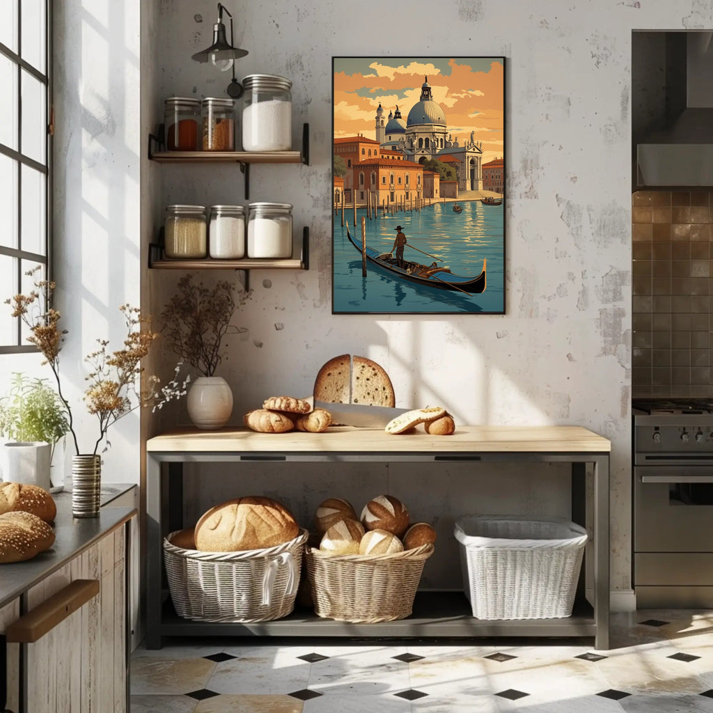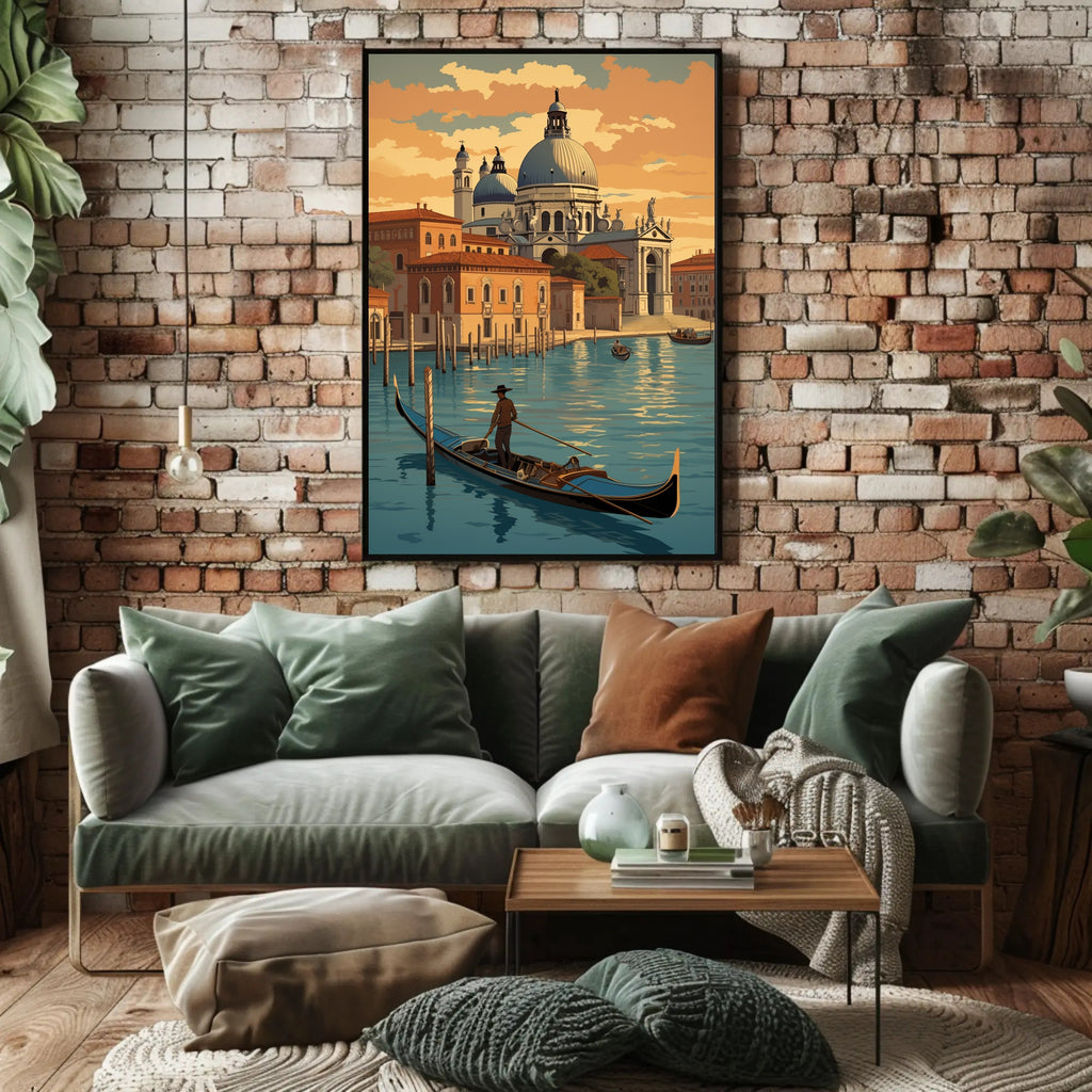 This stunning travel poster beautifully captures the essence of Venice, Italy, through an artistic portrayal of a gondolier steering a traditional gondola across the serene canals. The focal point is a grand domed building, resembling a historic church or cathedral, which enriches the scene with Renaissance or Baroque architectural charm. The warm, golden hues of the sky create a romantic, serene atmosphere, suggesting a mesmerizing sunrise or sunset. The vintage and illustrative style, characterized by bold outlines and a warm color palette, evokes nostalgia and wanderlust, perfect for those inspired by travel and cultural exploration.