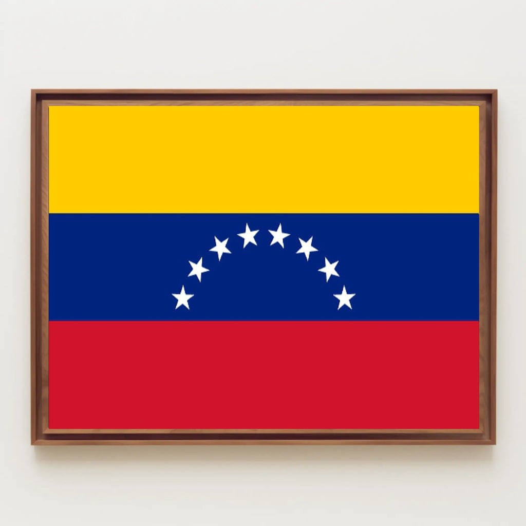Celebrate Venezuelan identity with a bold, minimalist poster from PosterGoat that captures the unmistakable spirit of the Venezuelan flag. Crisp horizontal bands of vibrant yellow, deep blue, and rich red are rendered with clean edges, while the elegant semicircle of white stars on the blue stripe creates a striking focal point—perfect for homes, offices, cafes, or cultural spaces.
