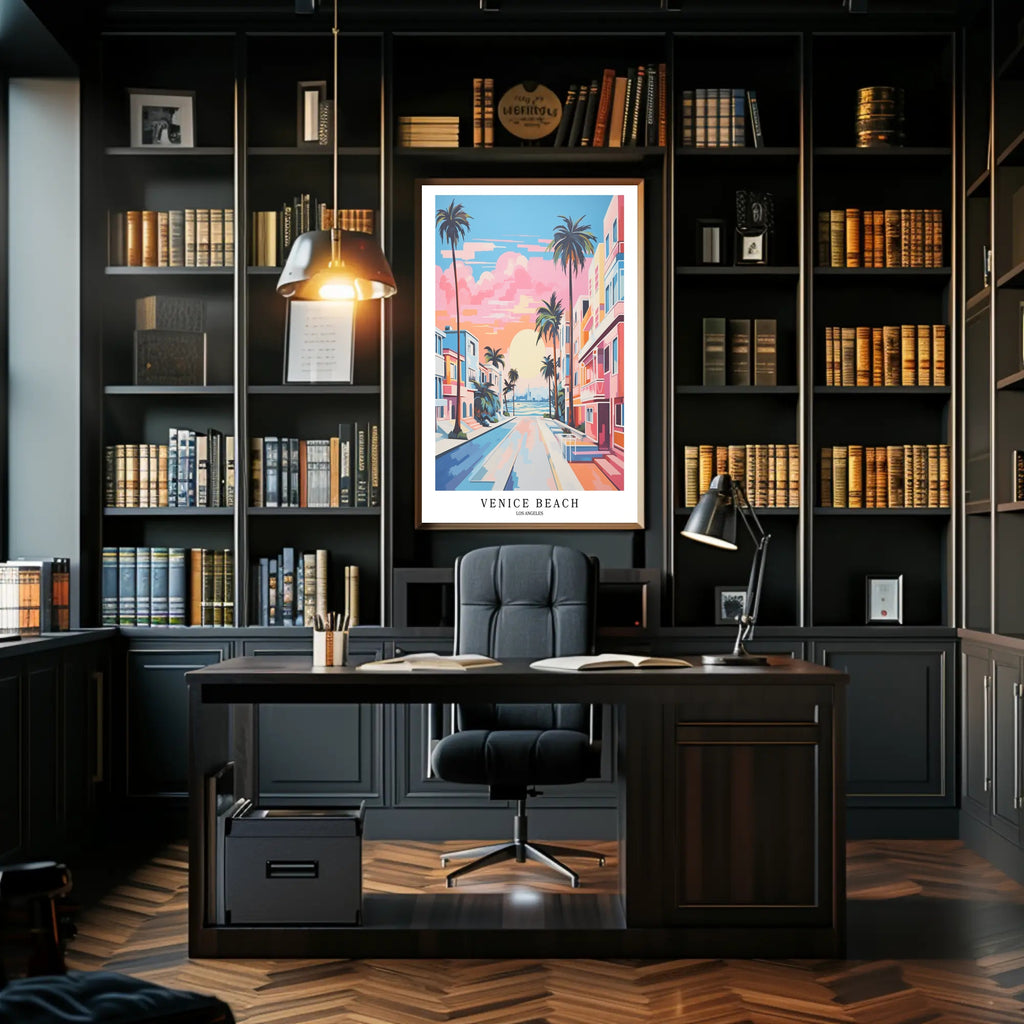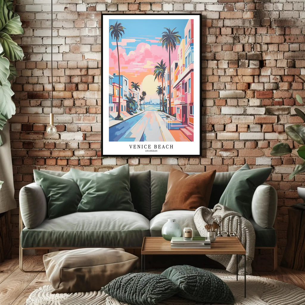 Rendered in a vivid sunset palette of coral pinks, warm oranges and cool blues, the print’s clean geometric blocks and soft gradients create a contemporary, retro-inspired mood that brightens any room. A white border and elegant “VENICE BEACH • LOS ANGELES” title give the piece a gallery-ready finish that suits living rooms, home offices, bedrooms and entryways.