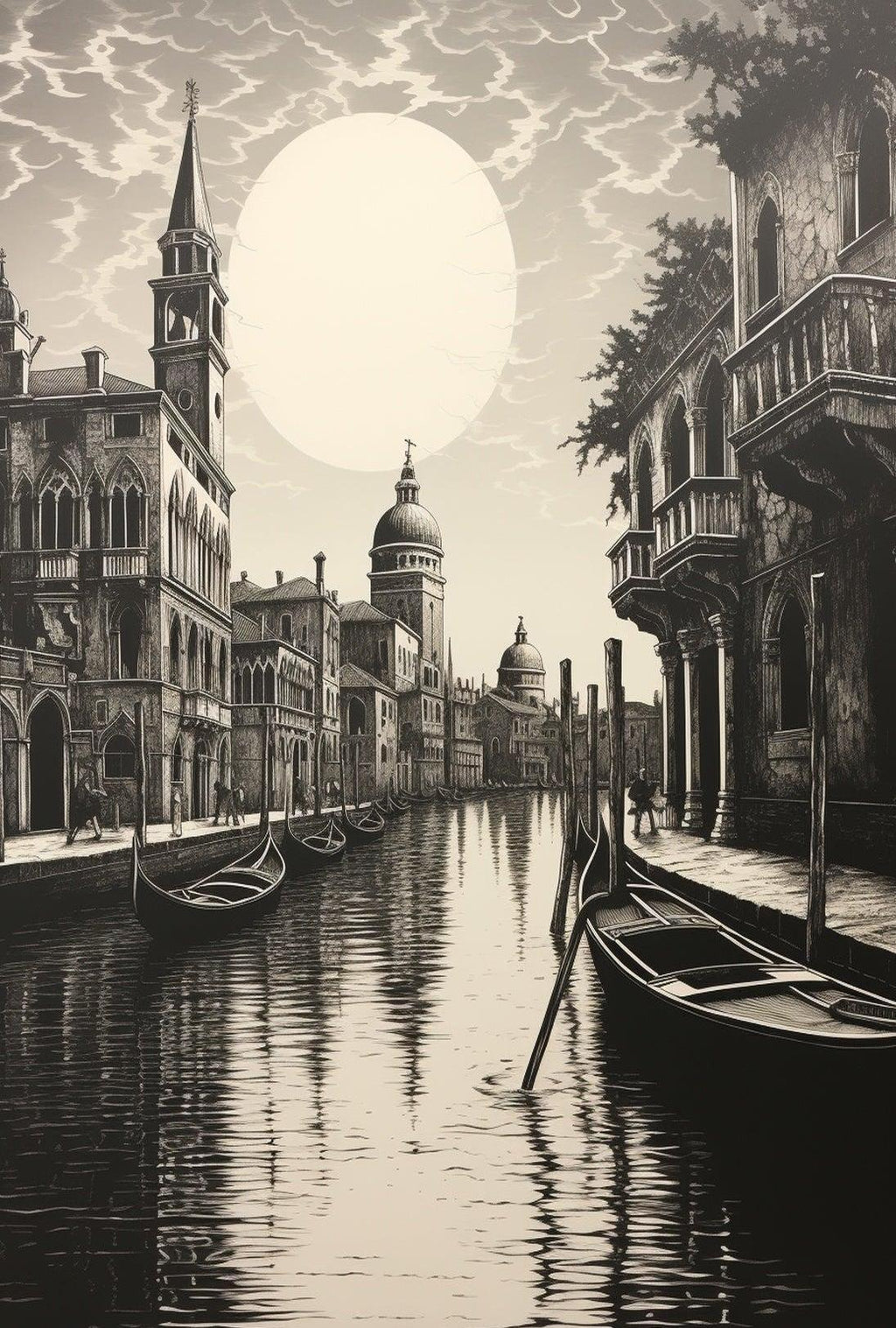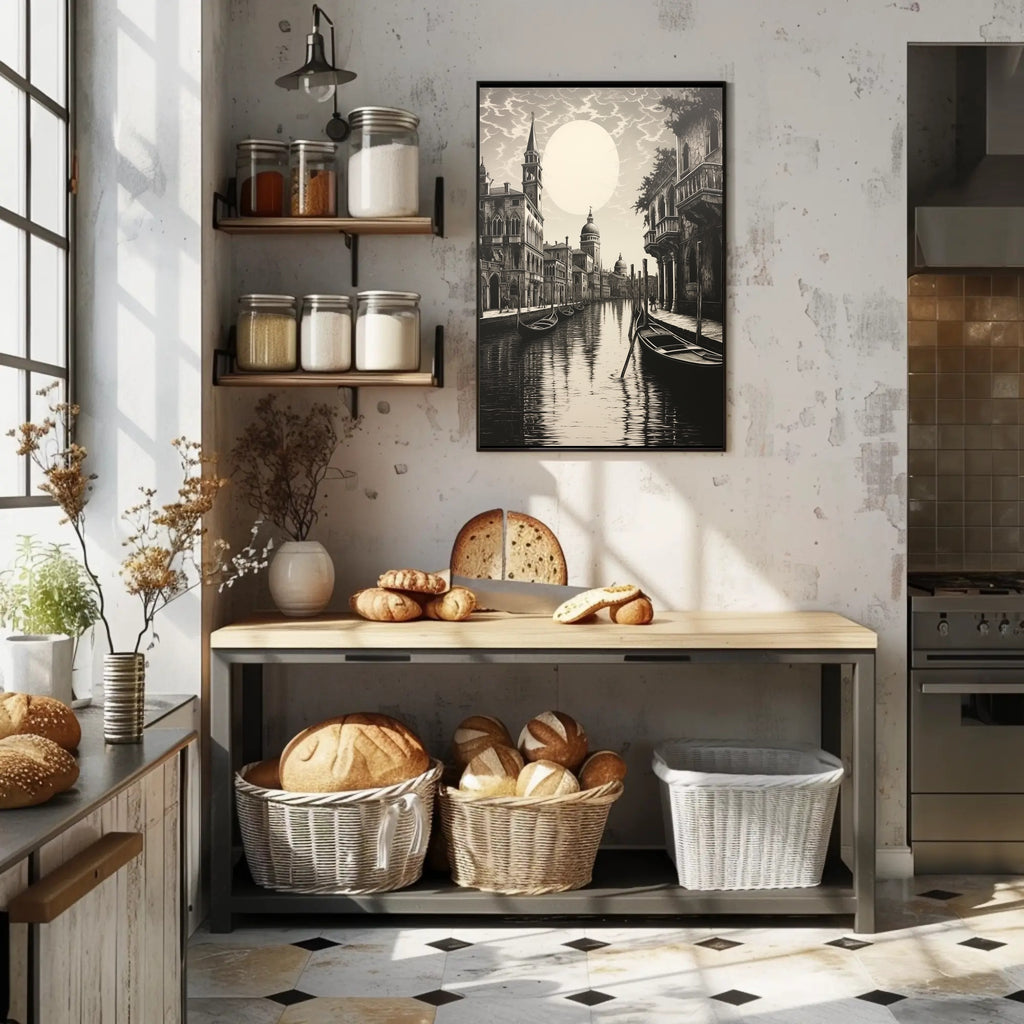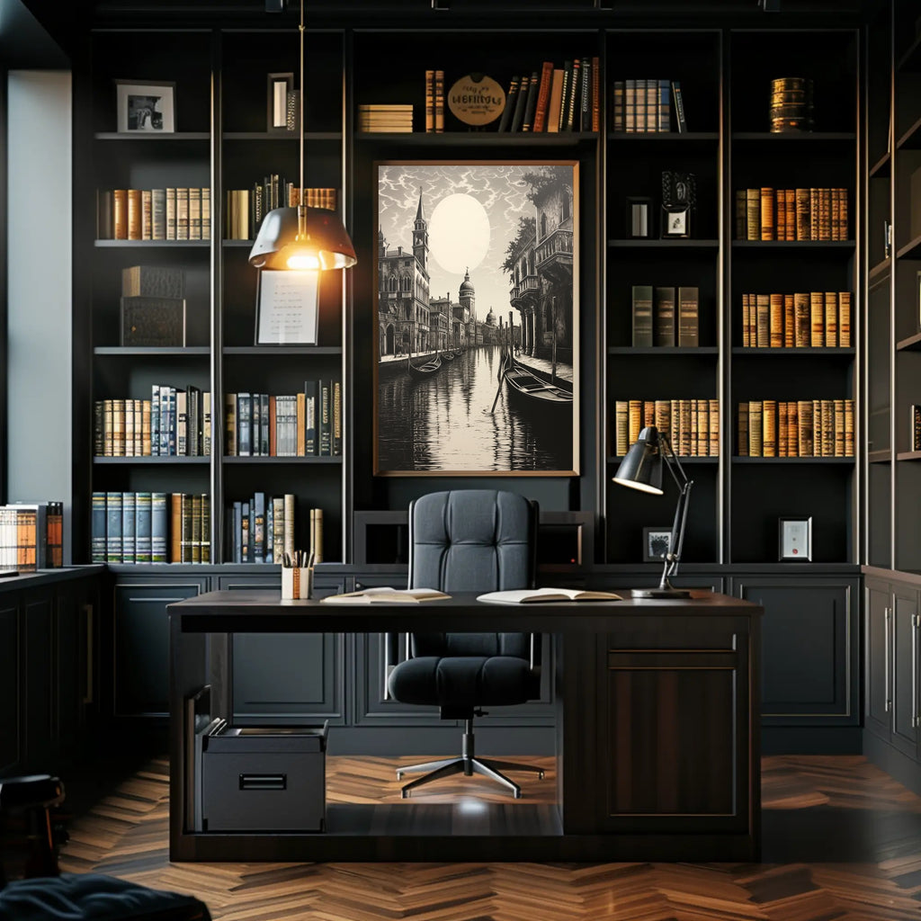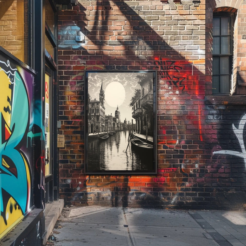 This poster depicts a serene canal scene framed by ornate medieval facades and elegant balconies, with slender gondolas resting on reflective water beneath a luminous moon. The vintage collage style and finely detailed linework create a sophisticated focal point perfect for living rooms, bedrooms, offices, or travel-themed interiors.