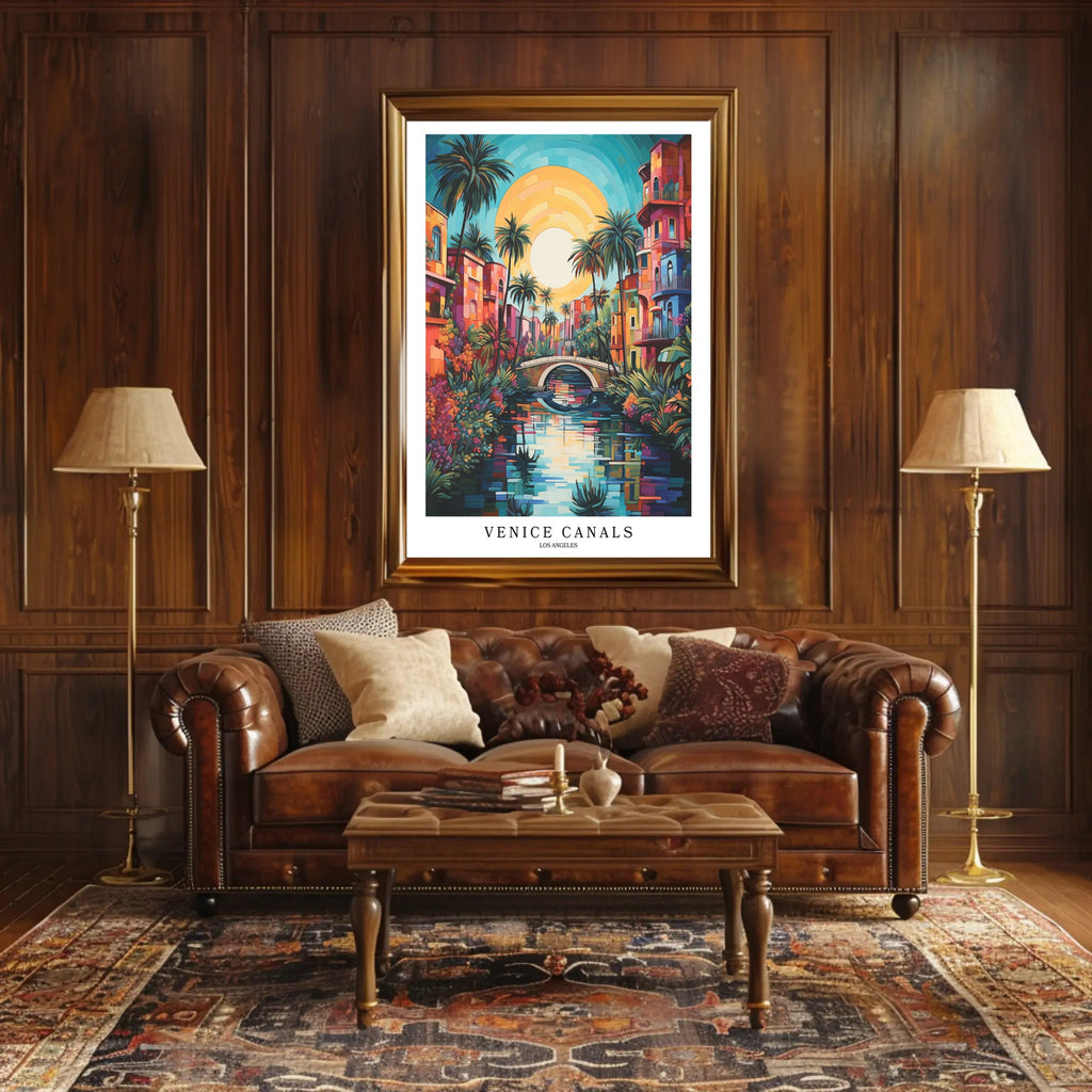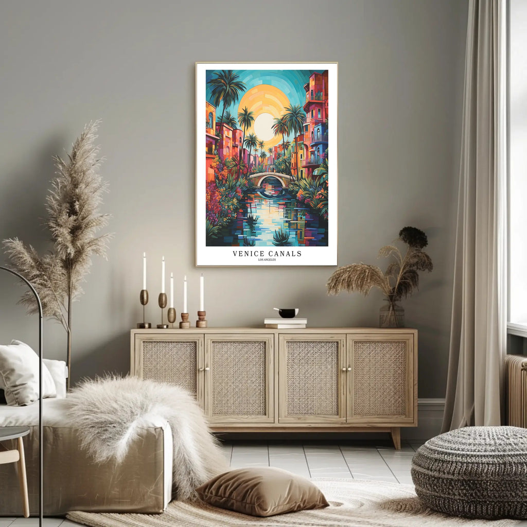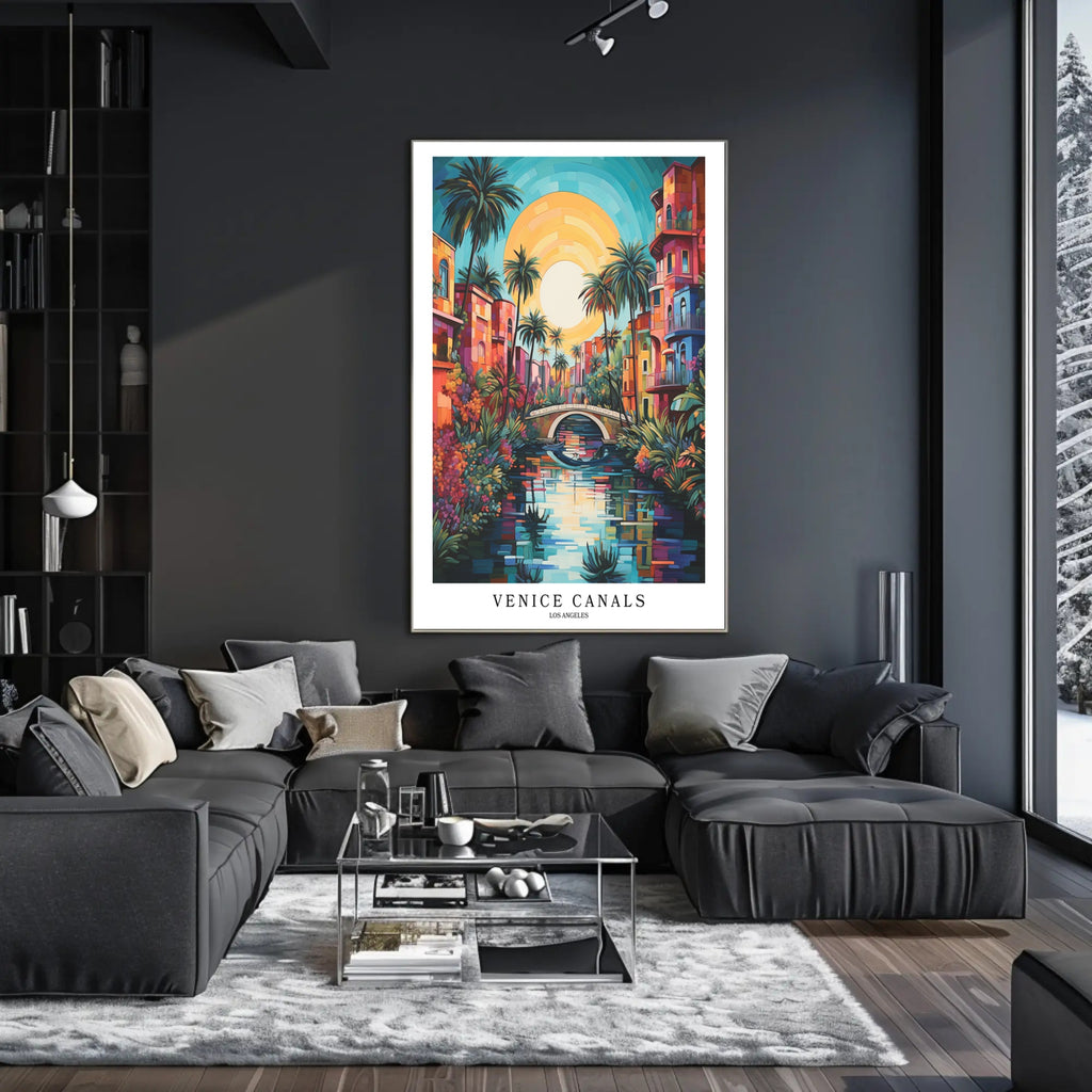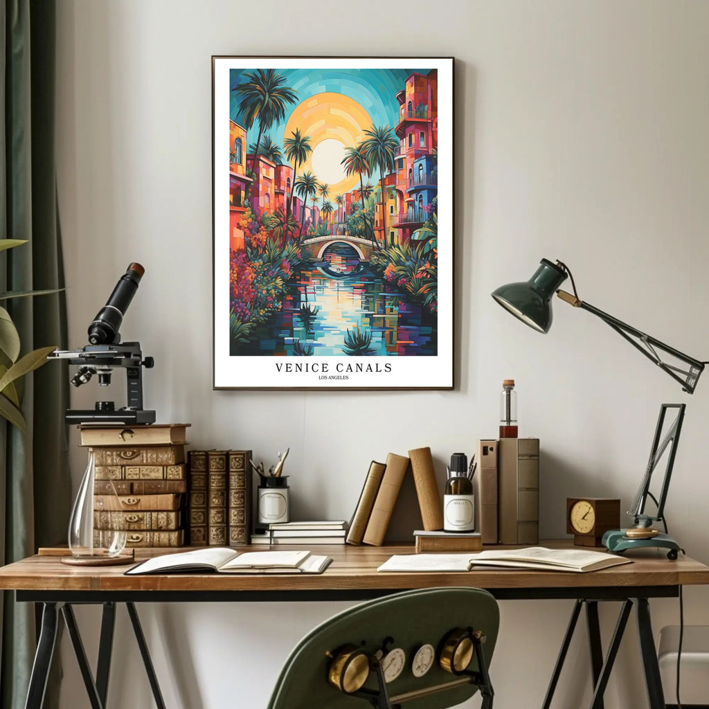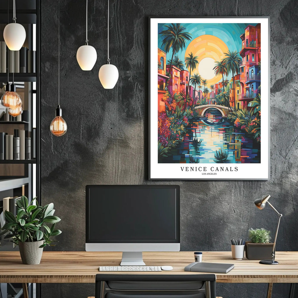 Bring the magic of the Venice Canals into your home with this vibrant PosterGoat art print. Rich, mosaic-like color blocks, swaying palms, a charming arched bridge and a single gondola glide across reflective canal waters beneath a golden sun halo—an evocative cityscape that blends travel nostalgia with modern, minimalist design.
