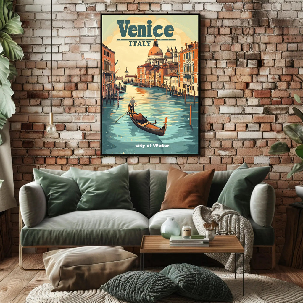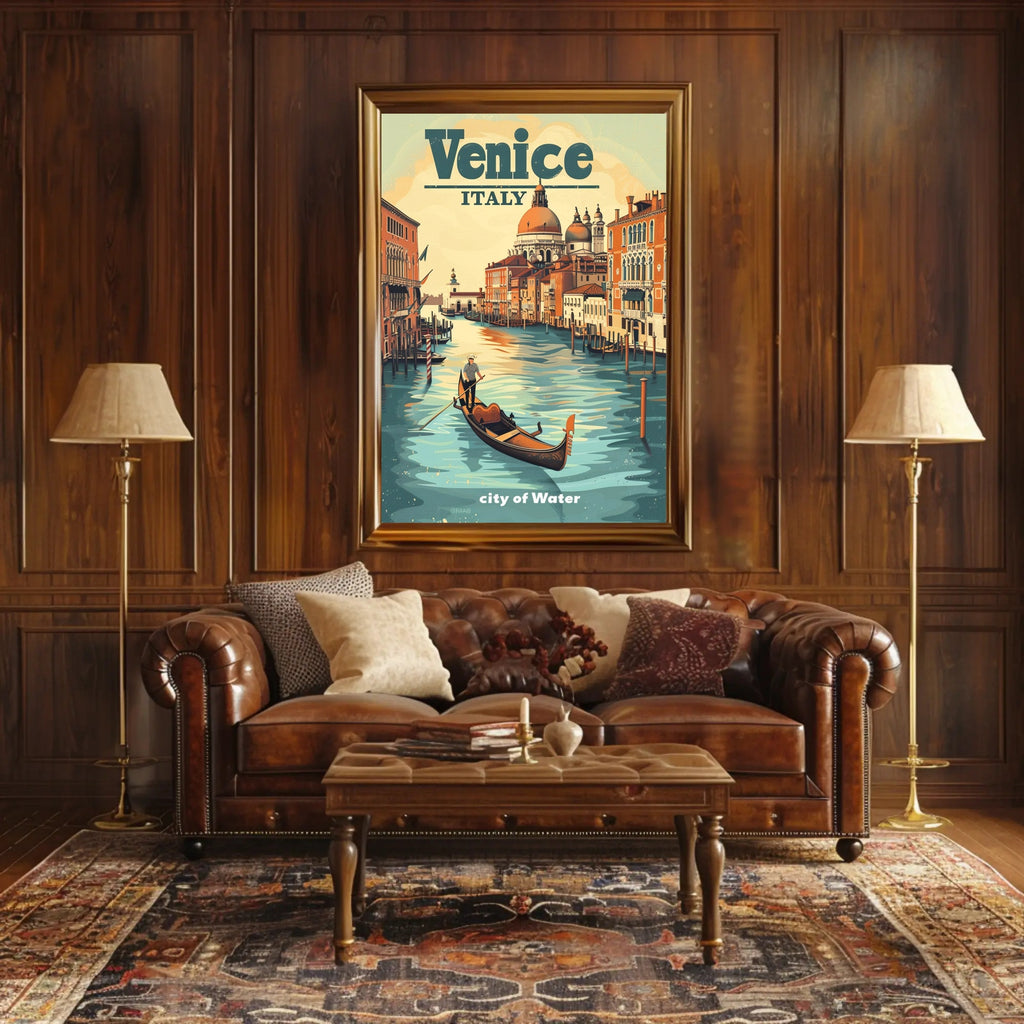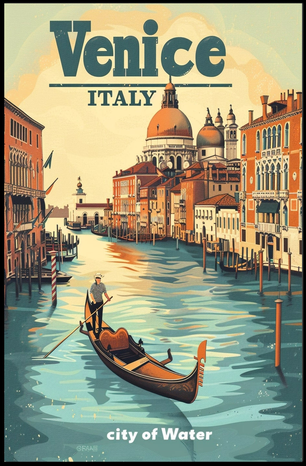 Transport your space to the timeless canals of Italy with the "Venice Gondola Journey: Romantic Travel Poster" from PosterGoat. This nostalgic travel art piece captures a solitary gondola gliding beneath graceful bridges, mirrored by warm retro tones and classic Venetian domes — an evocative blend of romance, history, and minimalist design that complements modern and vintage interiors alike.