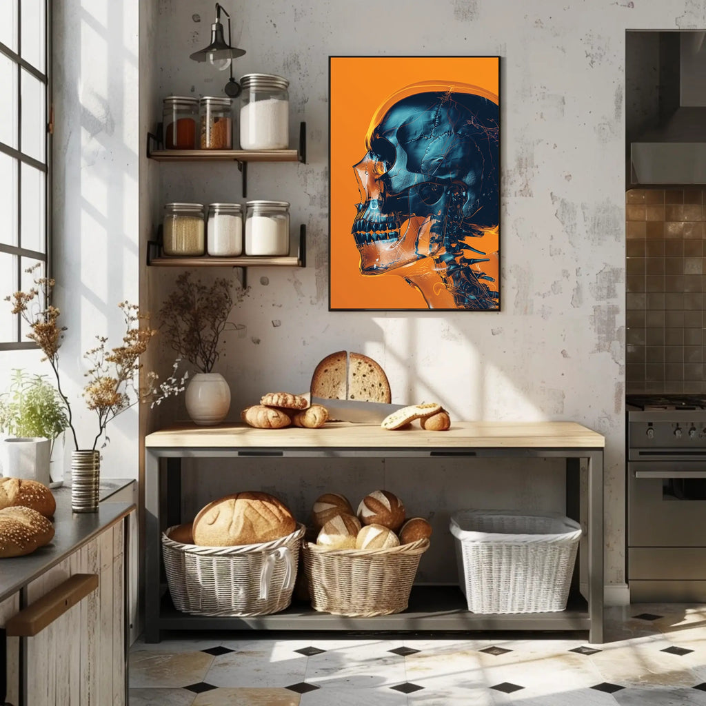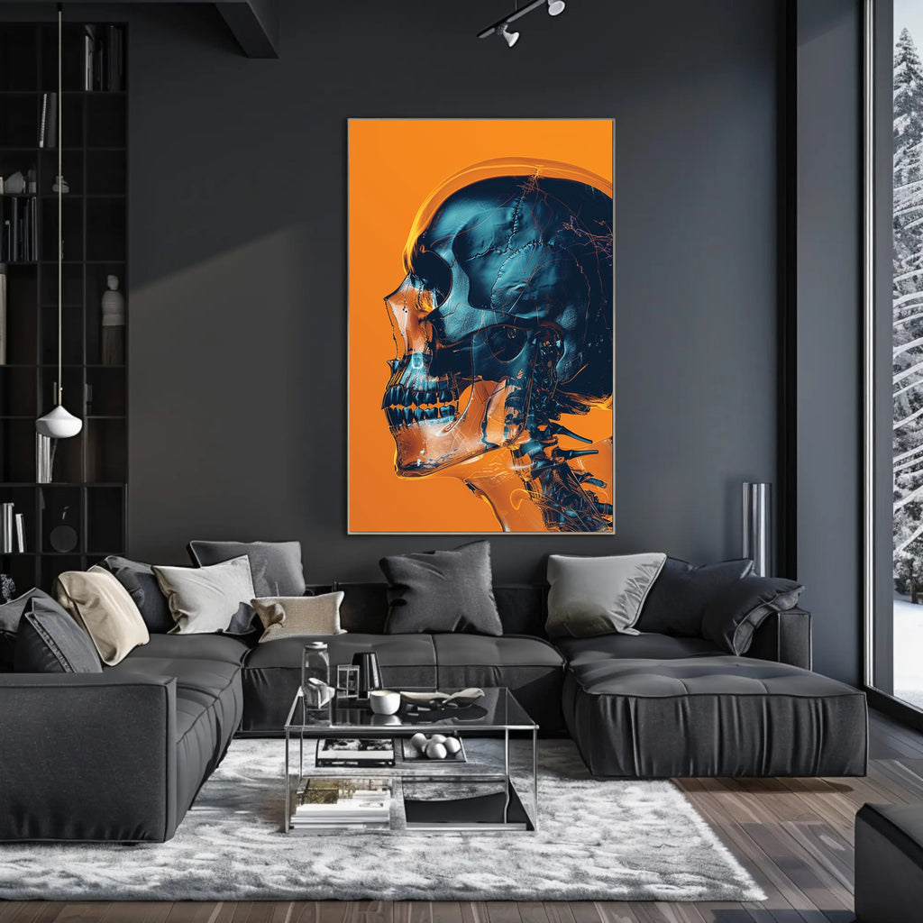 Vibrant Anatomy Poster — a bold, museum-quality art print from PosterGoat that transforms science into striking decor. This Pop Art-inspired anatomical illustration pairs electric teal skull detail with a high-contrast orange background to create an eye-catching focal point for any room. Perfect for home galleries, modern offices, medical studios, or as a unique gift for art and anatomy lovers.