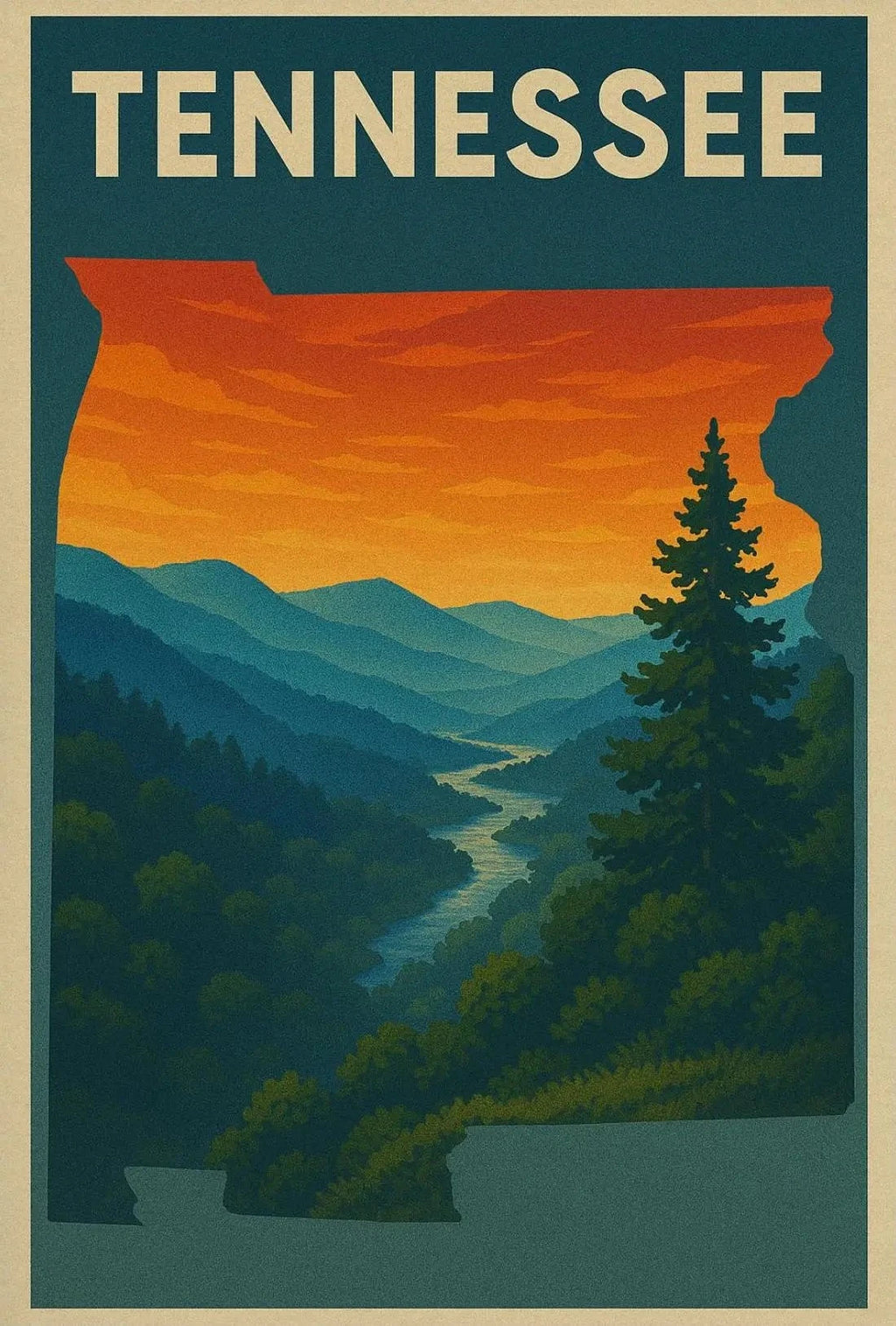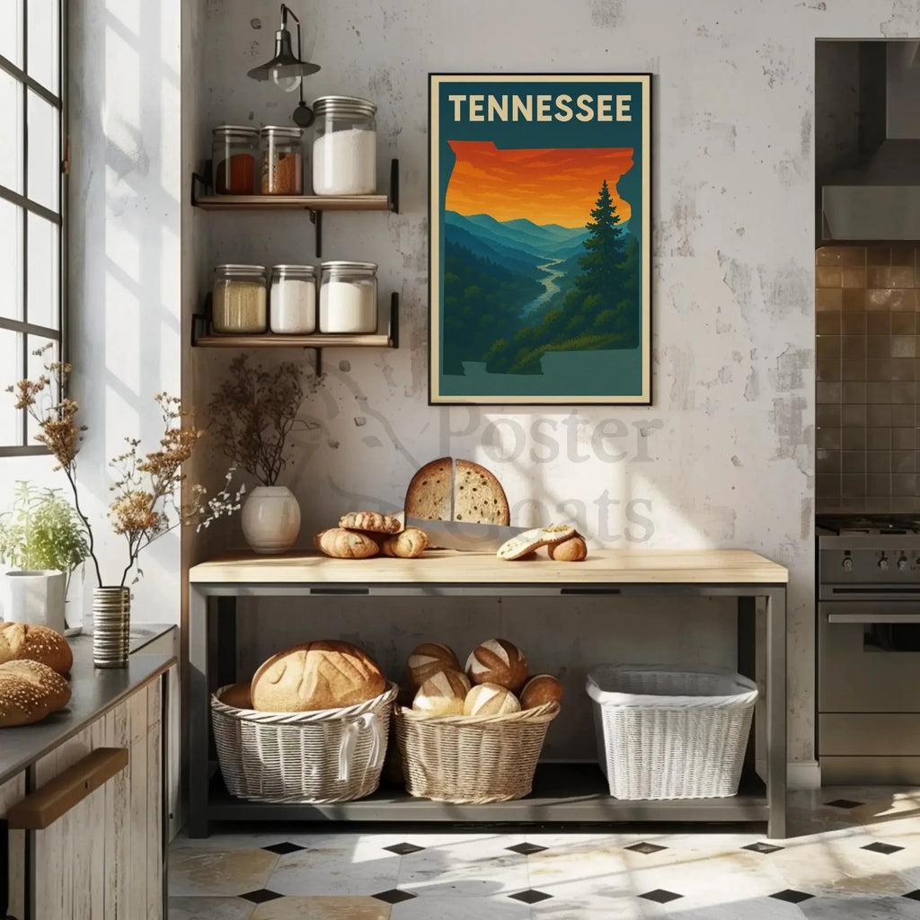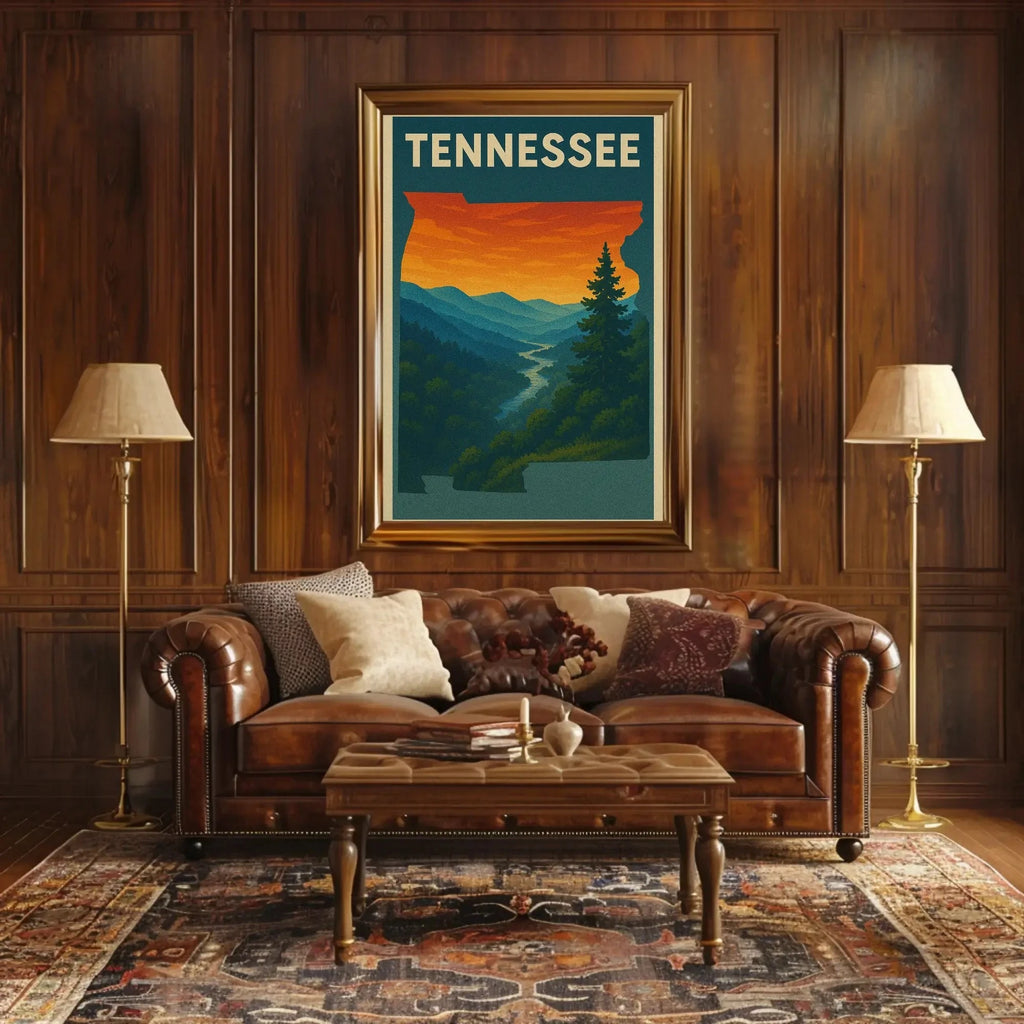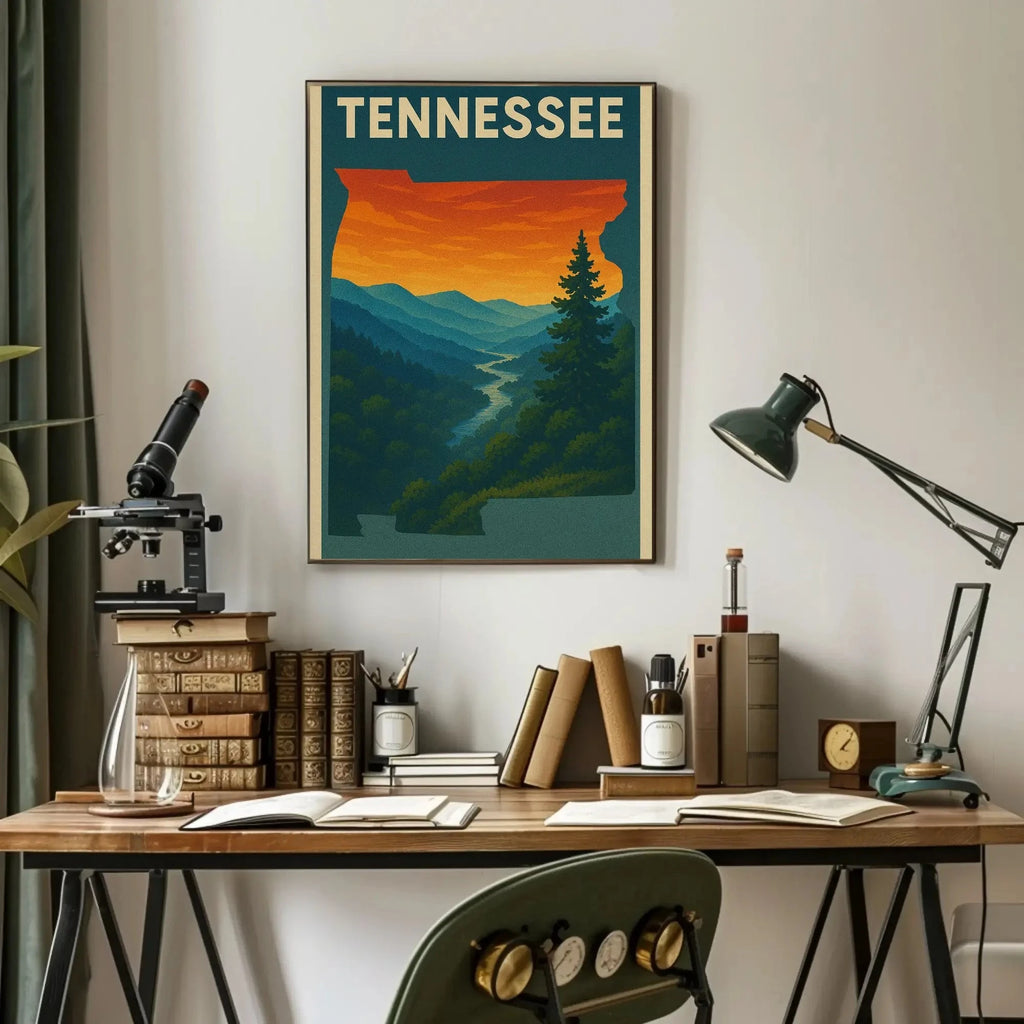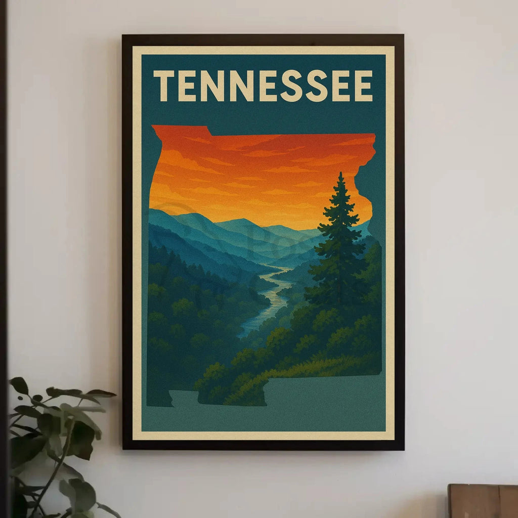 Bring bold color and modern energy to your walls with the "Vibrant Artistic Masterpiece Abstract Artistic Poster" from PosterGoat. This eye-catching poster blends mid-century aesthetic with pop-art vibrancy — rich orange sunsets, layered teal mountain ranges, a winding river and a silhouetted pine create a dramatic focal point that energizes living rooms, creative studios, or gallery-style walls.