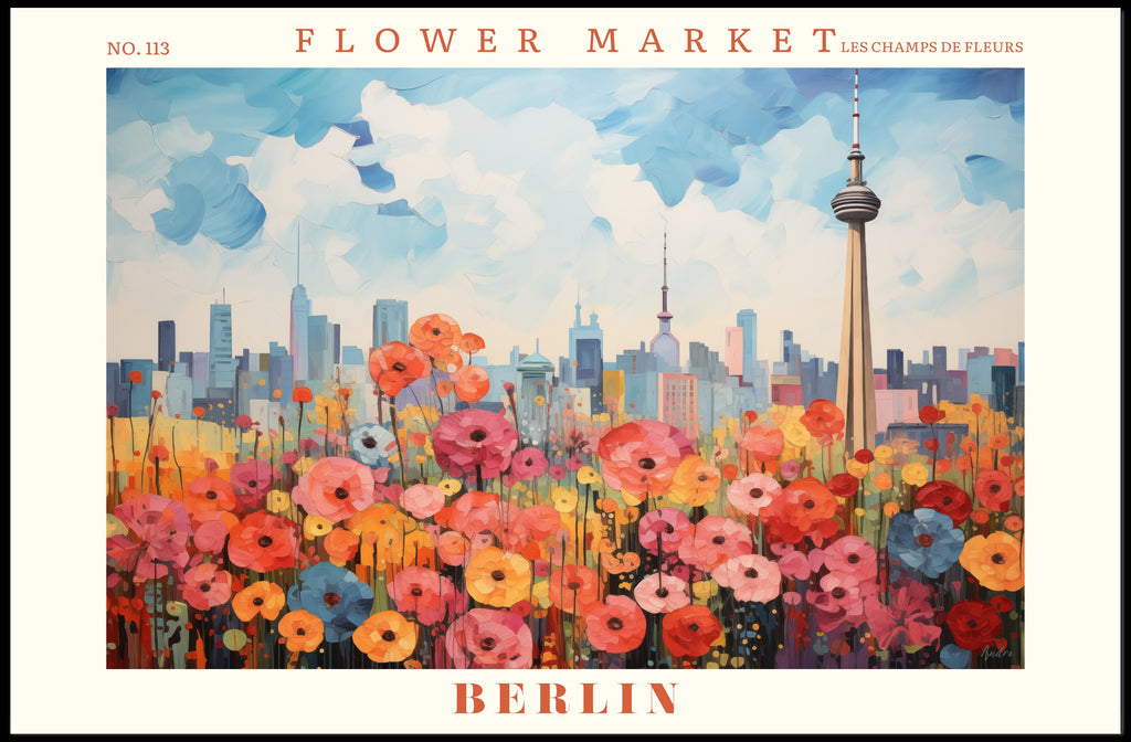 Bring Berlin's energy home with a vivid fusion of cityscape and nature. This PosterGoat original captures a blossoming flower market in the foreground with a striking Berlin skyline and the unmistakable silhouette of the Berliner Fernsehturm rising through a sky of sweeping impressionist strokes.