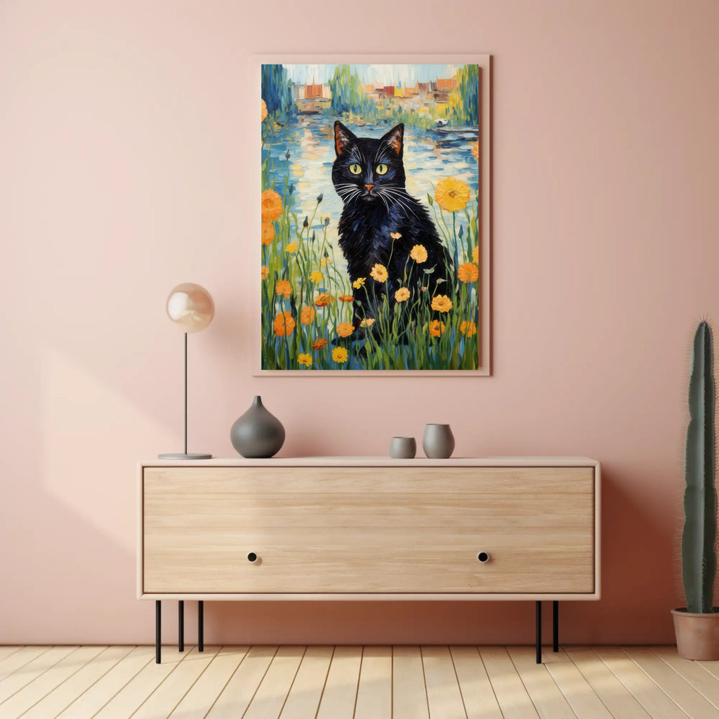 Bring a touch of countryside charm and expressive brushwork to your walls with the Vibrant Black Cat with Wildflowers Artistic Poster by PosterGoat. This impressionistic poster captures a glossy black cat with striking yellow eyes seated among tall, sunlit wildflowers in front of a tranquil, water-lit landscape — perfect for cat lovers and fans of colorful, nature-inspired decor.