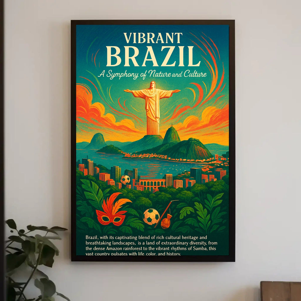 Capture the spirit of Brazil with this Vibrant Brazil A Symphony of Nature and Culture poster. This expressive art print blends lush landscapes with iconic cultural motifs, infusing any room with warmth, energy, and wanderlust. Designed for decor lovers and curious travelers, it sparks conversations and daily inspiration.