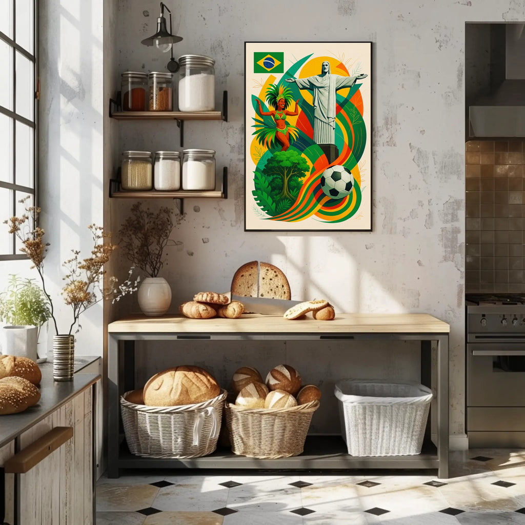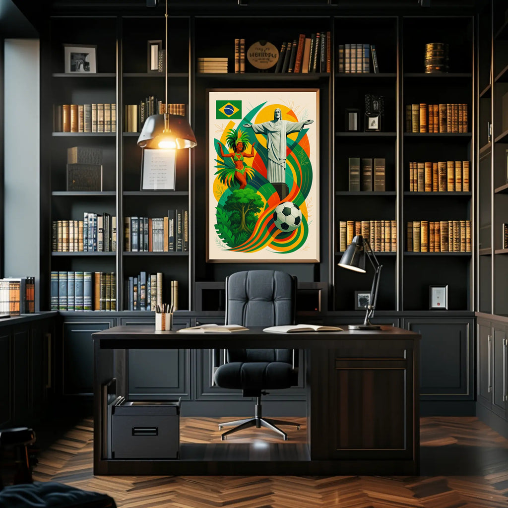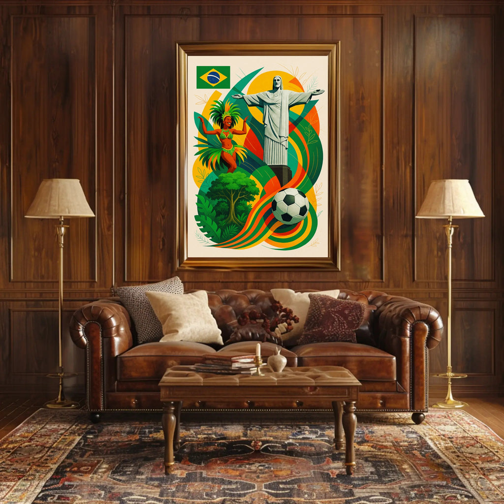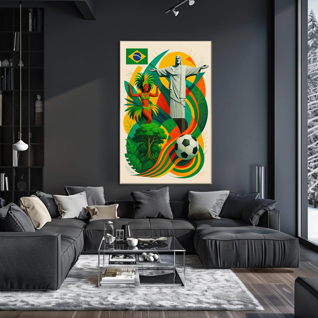 Features & benefits: Vivid, museum-quality color reproduction preserves the poster’s bold palette and intricate details; the vertical composition makes it a perfect focal point above consoles, bedside tables, or in a hallway; and the culturally rich imagery adds layered meaning — from samba rhythm to football passion and rainforest wonder.